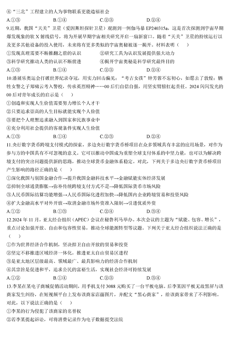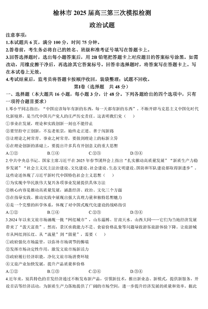 陕西榆林2025届高三第三次模拟检测政治试题及答案 时间:2025-03-11 陕西 文综试题 陕西榆林2025届高三第三次模拟检测政治考试已于近日开考,为方便考生考后及时查看考试情况,查漏补缺、弥补不足,本文整理了试题答案解析相关信息! 汇总:陕西榆林2025届高三第三次模拟检测试题及答案汇总 政治试题及答案解析