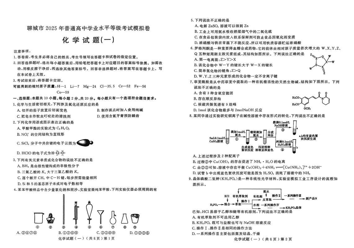 聊城一模2025年高三学业水平等级模拟卷化学试题及答案