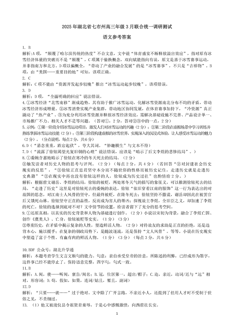 2025年湖北省七市州高三3月联合统一调研测试语文考试已于近日开考,为方便考生考后及时查看考试情况,查漏补缺、弥补不足,本文整理了试题答案解析相关信息!