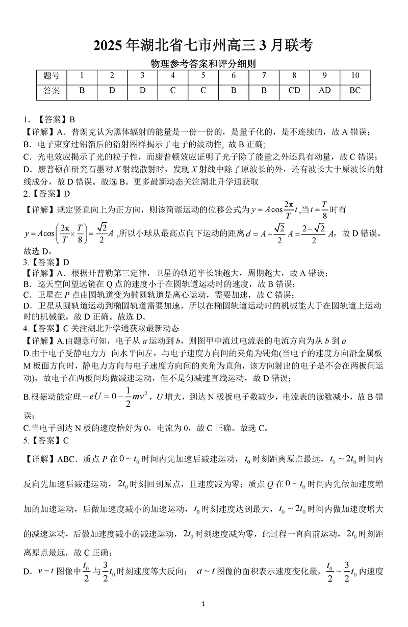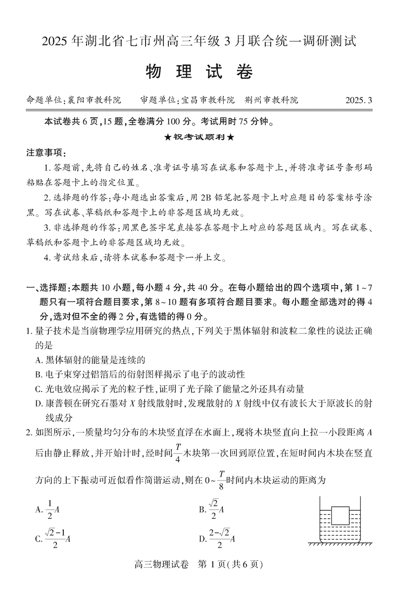 2025年湖北省七市州高三3月联合统一调研测试物理考试已于近日开考,为方便考生考后及时查看考试情况,查漏补缺、弥补不足,本文整理了试题答案解析相关信息!
