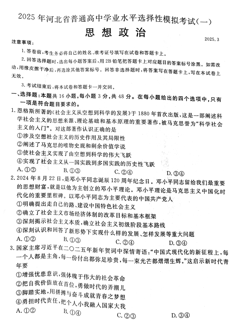 承德、张家口市2025届高三下学期统一模拟考试(一)政治考试已于近日开考,为方便考生考后及时查看考试情况,查漏补缺、弥补不足,本文整理了试题答案解析相关信息!