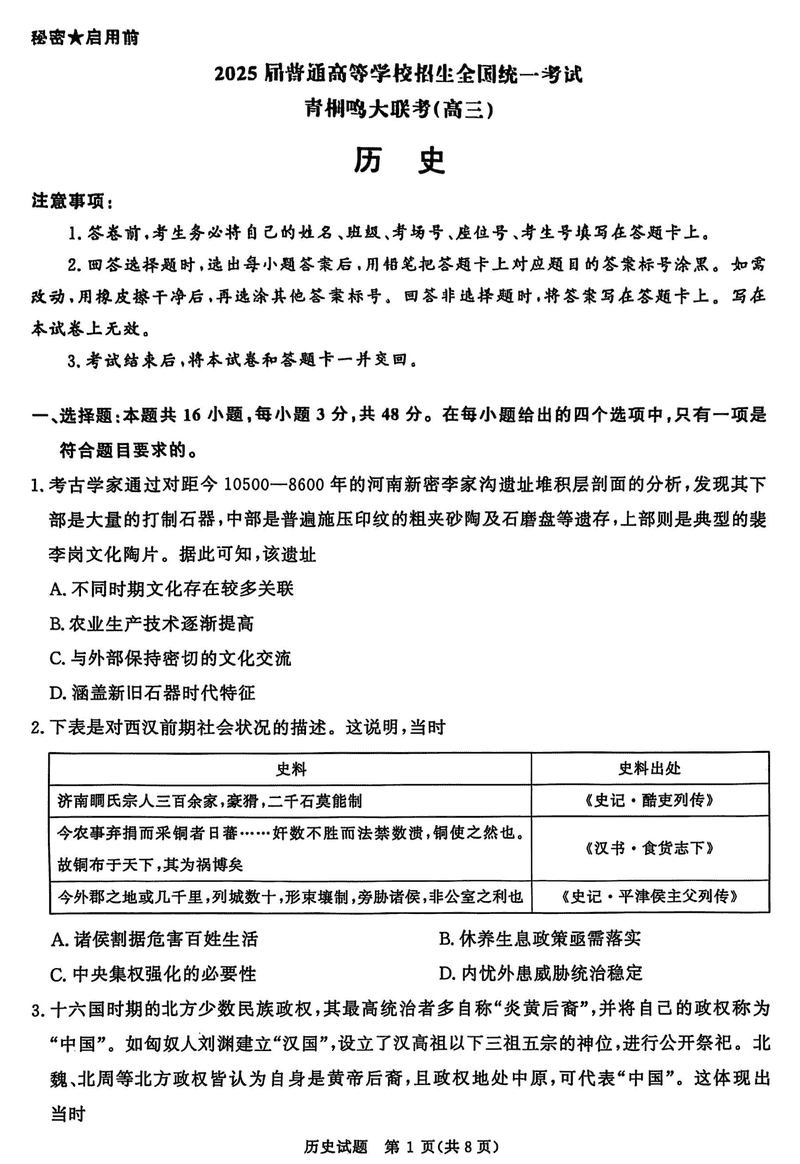河南青桐鸣大联考2025届高三下学期3月月考历史考试已于近日开考,为方便考生考后及时查看考试情况,查漏补缺、弥补不足,本文整理了试题答案解析相关信息!