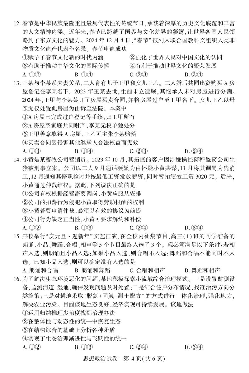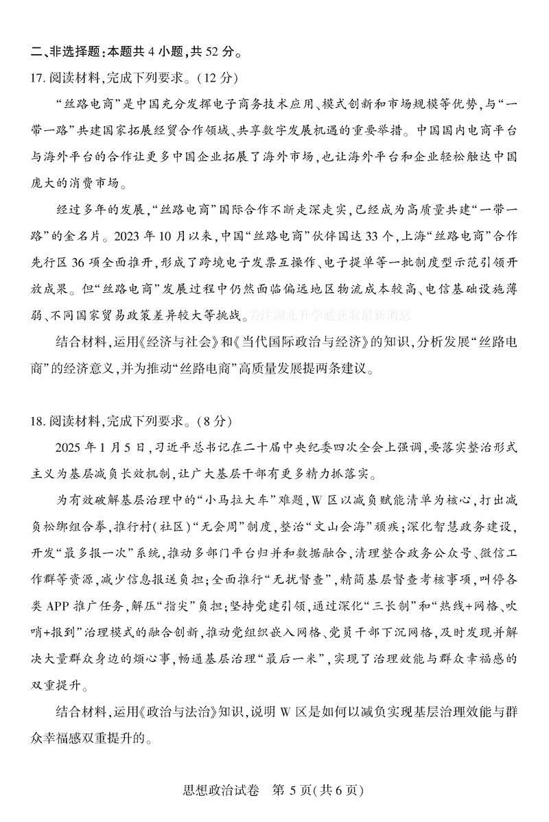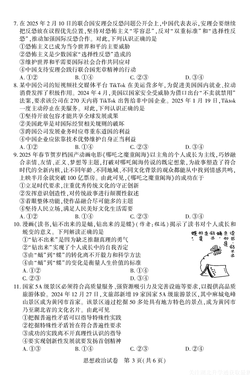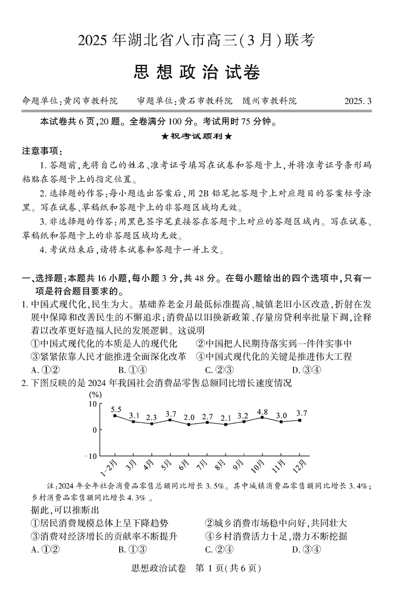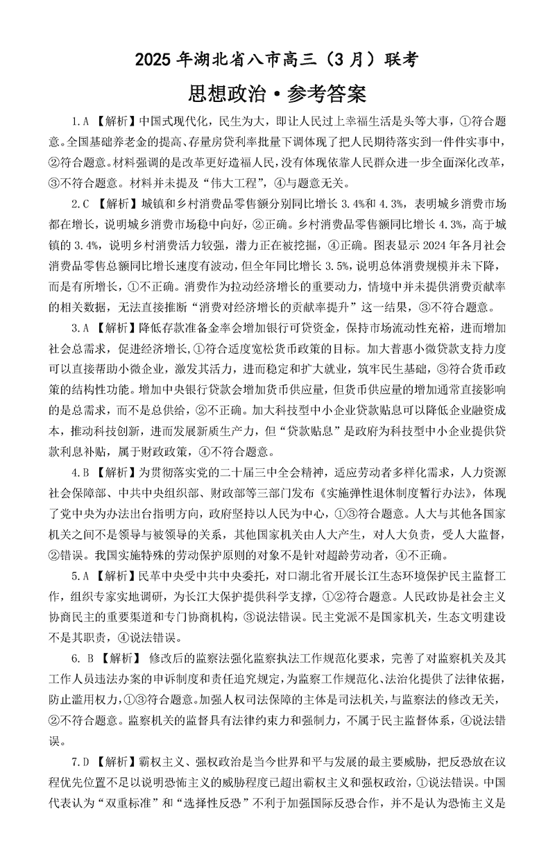 2025年湖北省八市高三3月联考政治试题及答案 时间:2025-03-15 湖北 文综试题 2025年湖北省八市高三3月联考政治考试已于近日开考,为方便考生考后及时查看考试情况,查漏补缺、弥补不足,本文整理了试题答案解析相关信息! 汇总:2025年湖北省八市高三3月联考试题及答案汇总 政治试题及答案解析