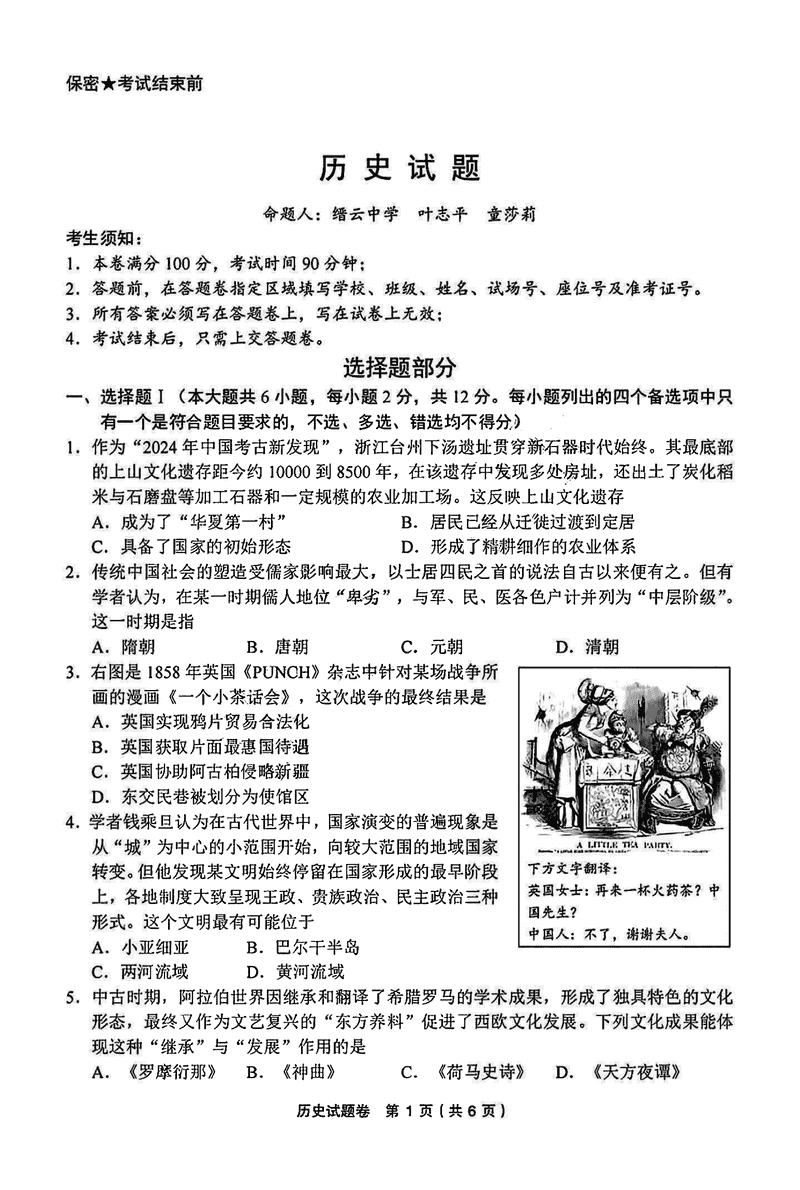 金丽衢十二校2025届高三第二次联考历史试题及答案