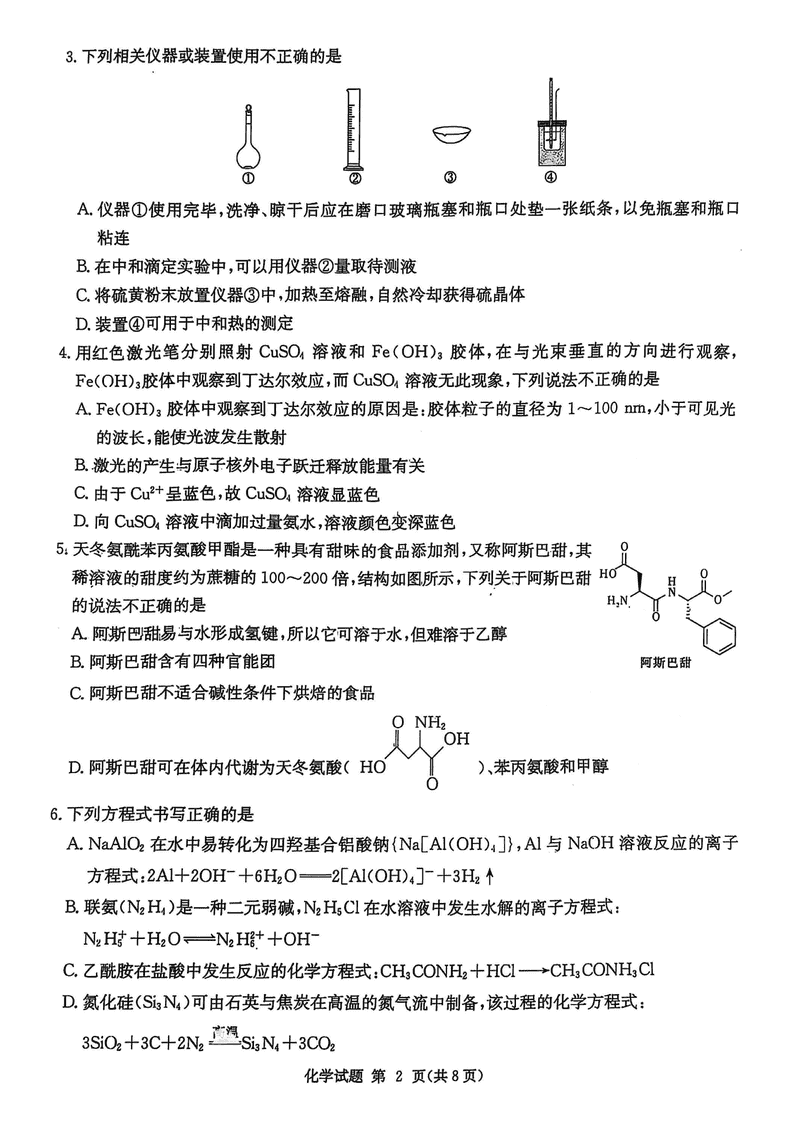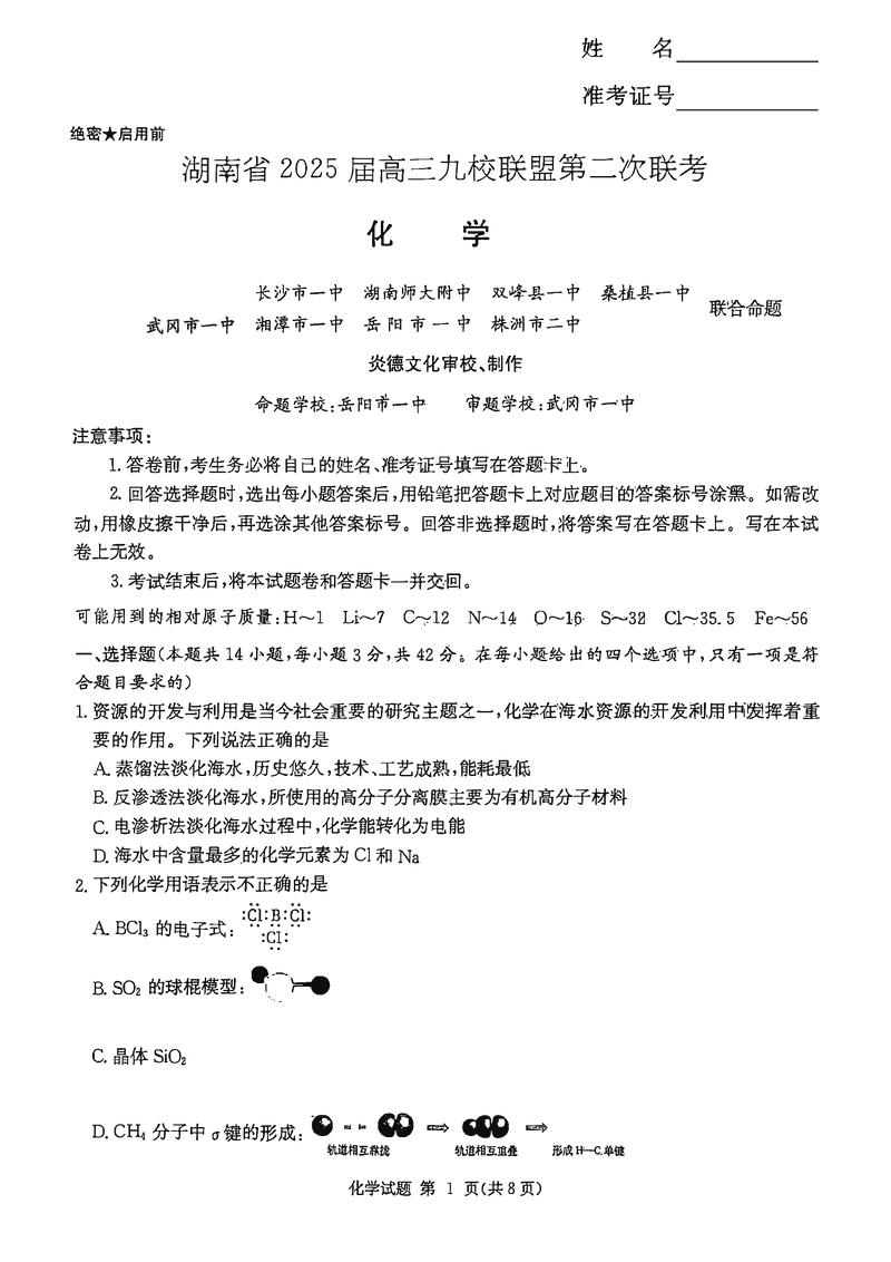 湖南省九校联盟2025届高三下学期第二次联考化学试题及答案