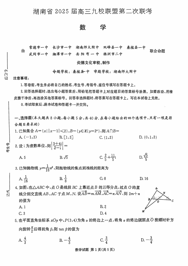 湖南省九校联盟2025届高三下学期第二次联考数学考试已于近日开考,为方便考生考后及时查看考试情况,查漏补缺、弥补不足,本文整理了试题答案解析相关信息!