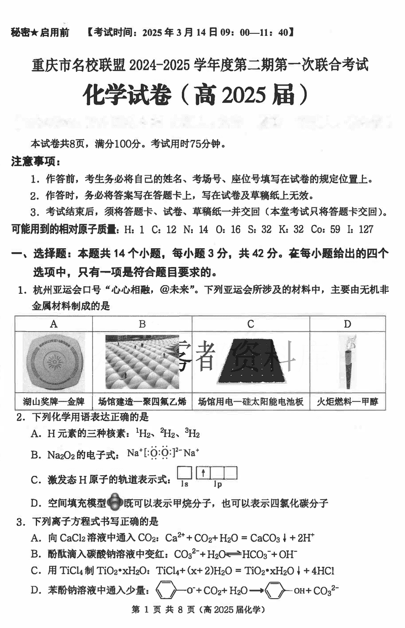 重庆名校联盟2024-2025学年度高三下第一次联考化学考试已于近日开考,为方便考生考后及时查看考试情况,查漏补缺、弥补不足,本文整理了试题答案解析相关信息!