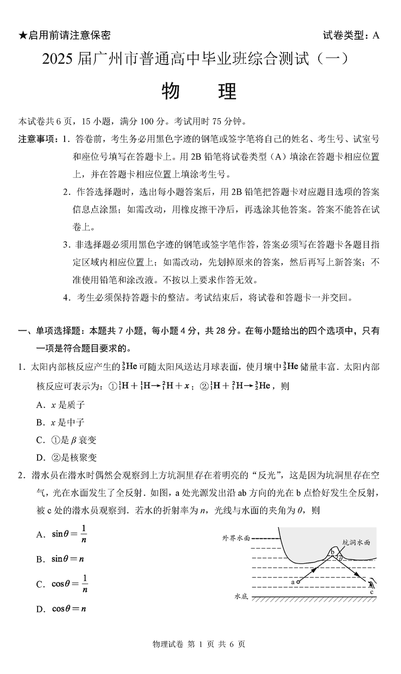 2025年广州市普通高中毕业班综合测试(一)物理试题及答案