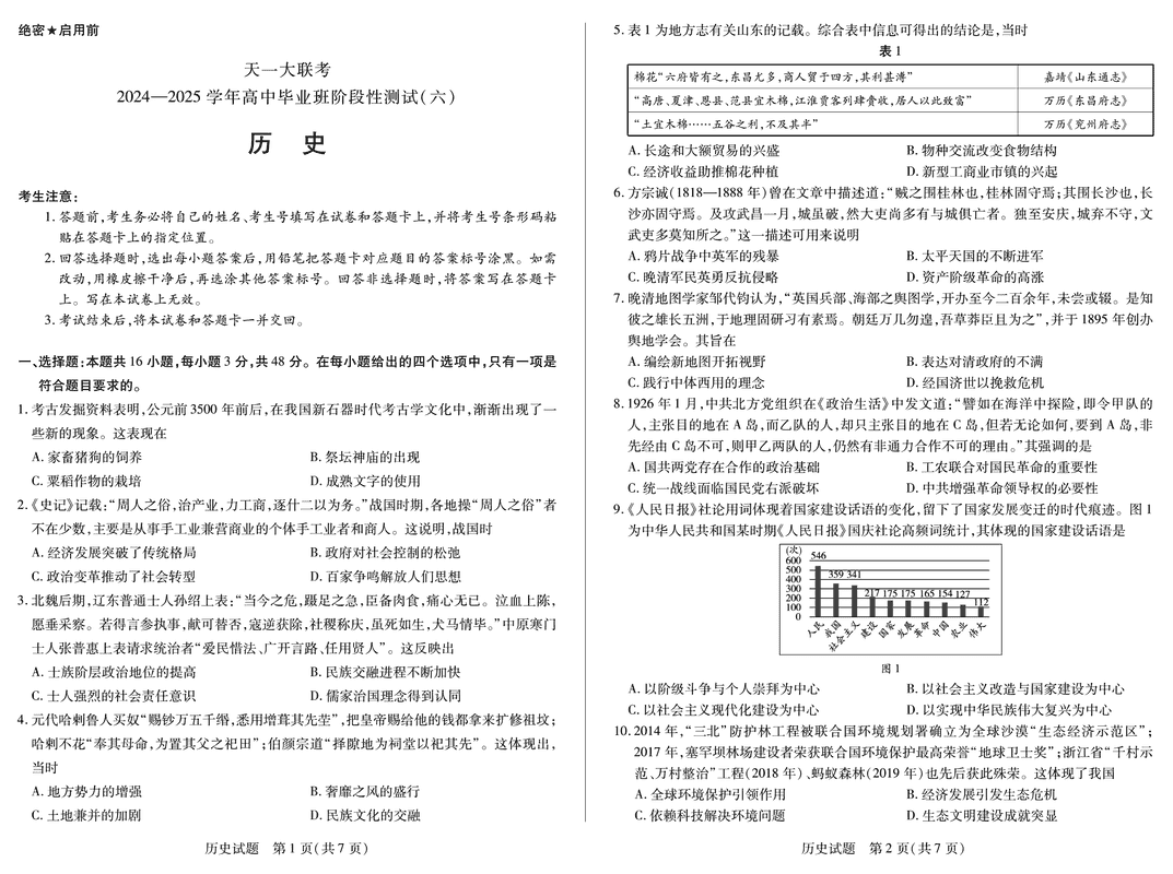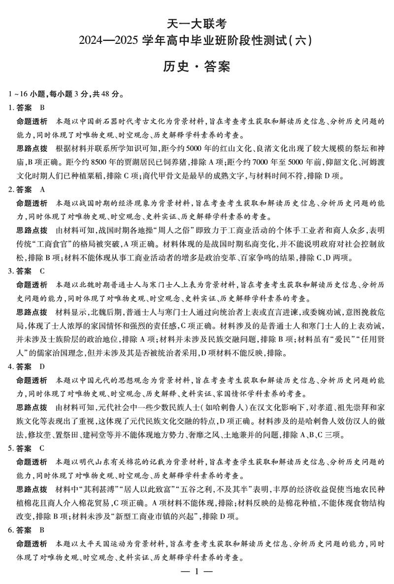 河南省天一大联考2024-2025学年高三阶段性测试(六)历史考试已于近日开考,为方便考生考后及时查看考试情况,查漏补缺、弥补不足,本文整理了试题答案解析相关信息!