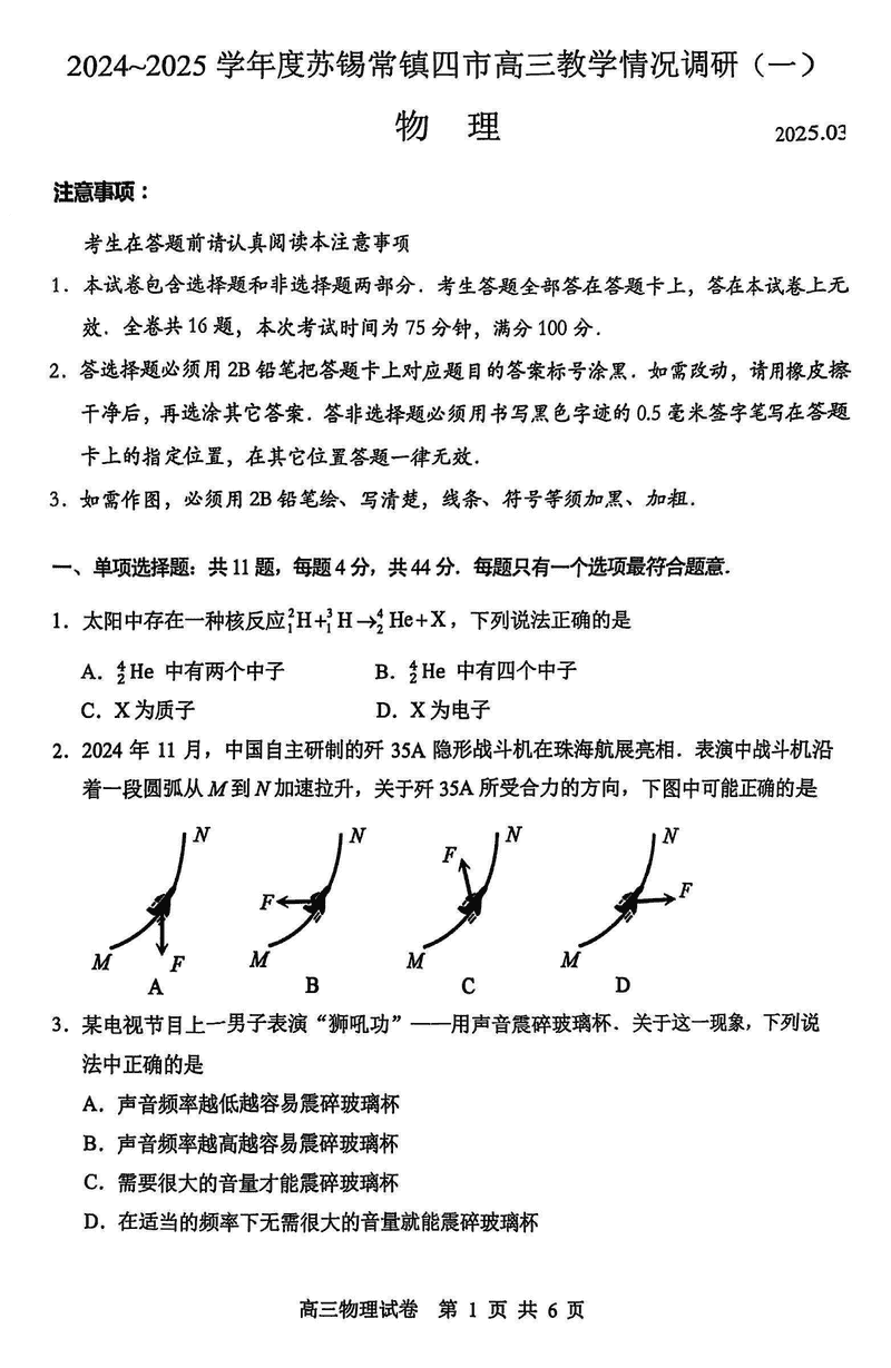 2025届苏锡常镇四市一模高三下学期教学情况调研(一)物理试题及答案