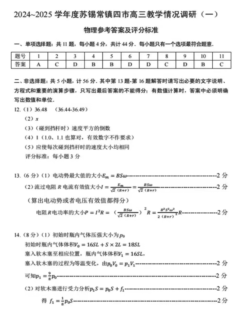 2025届苏锡常镇四市一模高三下学期教学情况调研(一)物理考试已于近日开考,为方便考生考后及时查看考试情况,查漏补缺、弥补不足,本文整理了试题答案解析相关信息!