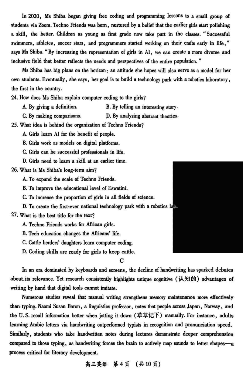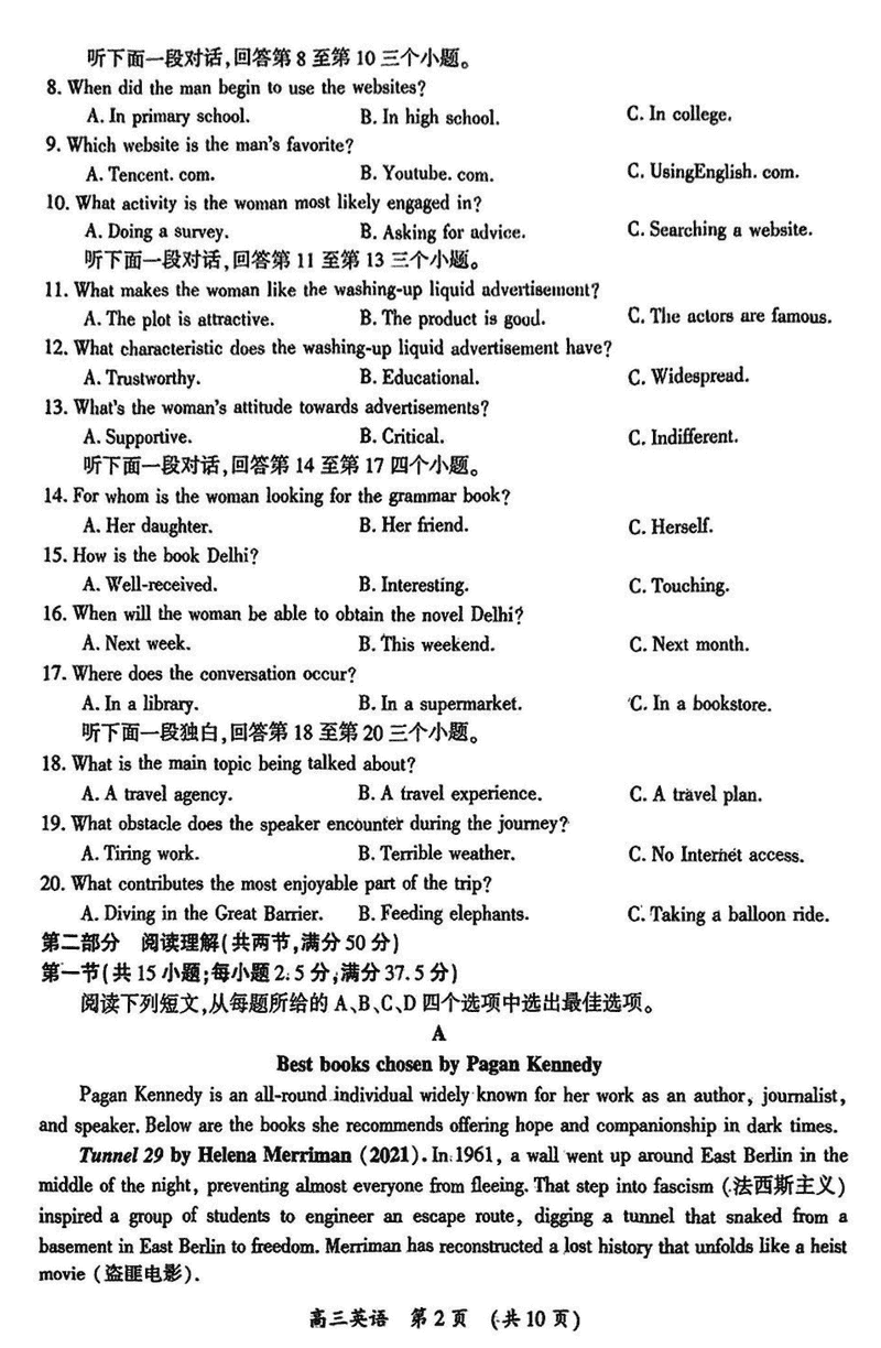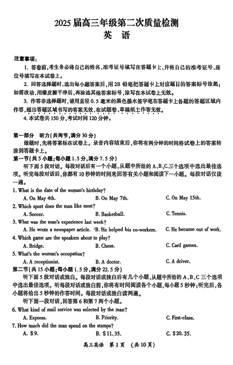 河南三市2025届高三第二次质量检测英语试题及答案 时间:2025-03-21 河南 英语试题 河南三市(开封市、周口市、商丘市)2025届高三第二次质量检测英语考试已于近日开考,为方便考生考后及时查看考试情况,查漏补缺、弥补不足,本文整理了试题答案解析相关信息! 汇总:河南三市2025届高三第二次质量检测试题及答案汇总 英语试题及答案解析