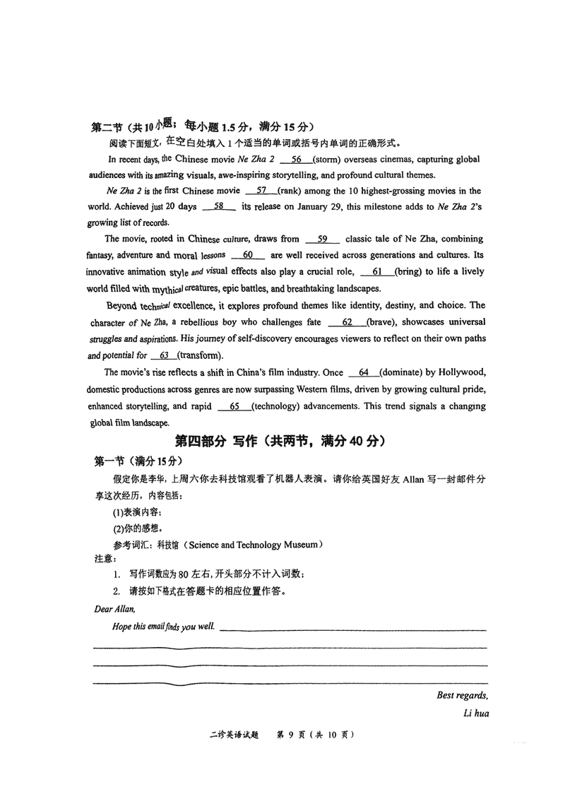 乐山市、自贡市、宜宾市2025届高三第二次诊断考英语试题及答案