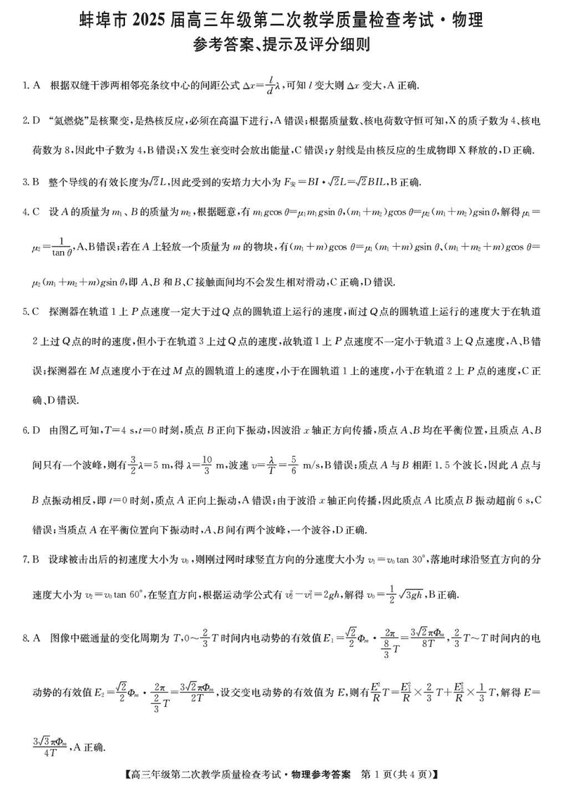 蚌埠市2025届高三第二次教学质检物理试题及答案 时间:2025-03-24 安徽 理综试题 蚌埠市2025届高三第二次教学质检物理考试已于近日开考,为方便考生考后及时查看考试情况,查漏补缺、弥补不足,本文整理了试题答案解析相关信息! 汇总:蚌埠市2025届高三第二次教学质量检查试题及答案汇总 物理试题及答案解析
