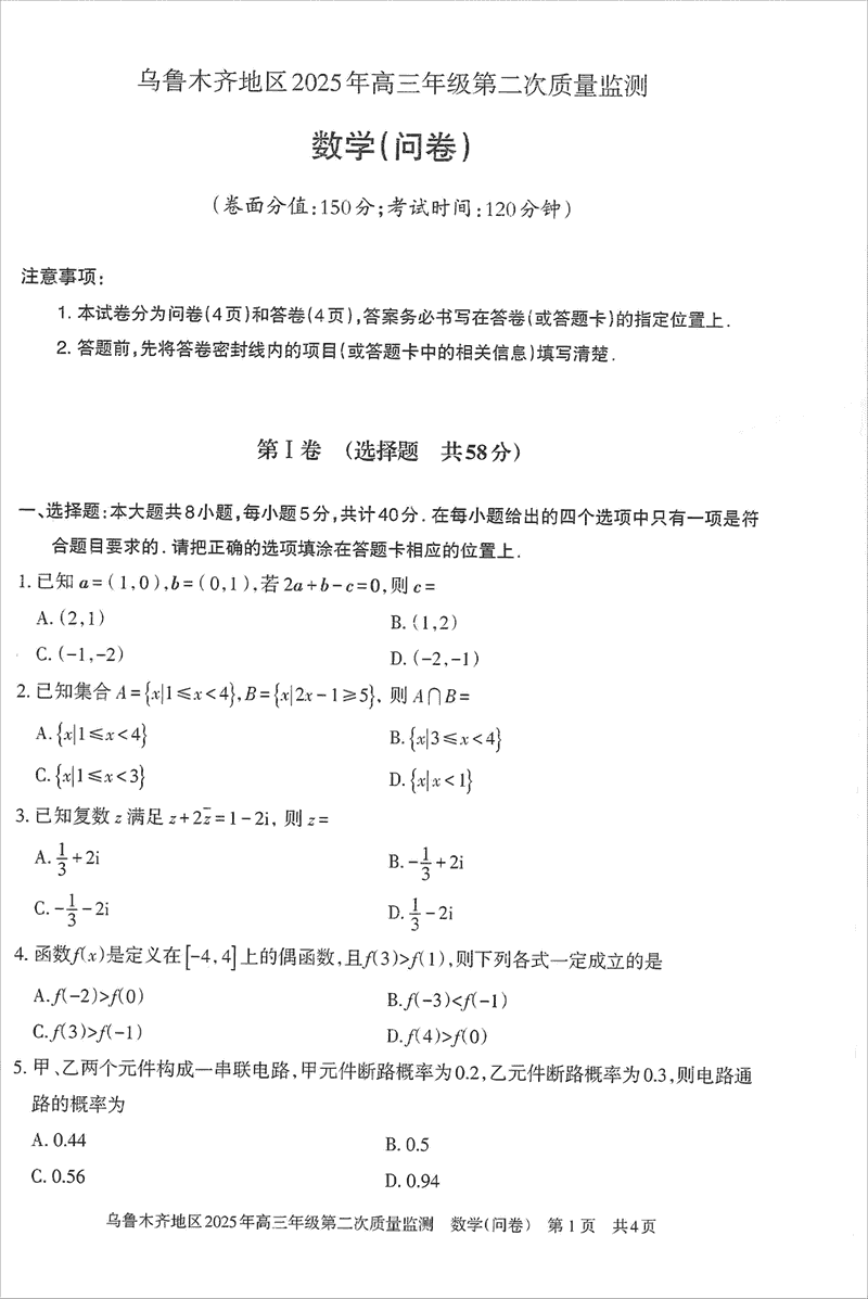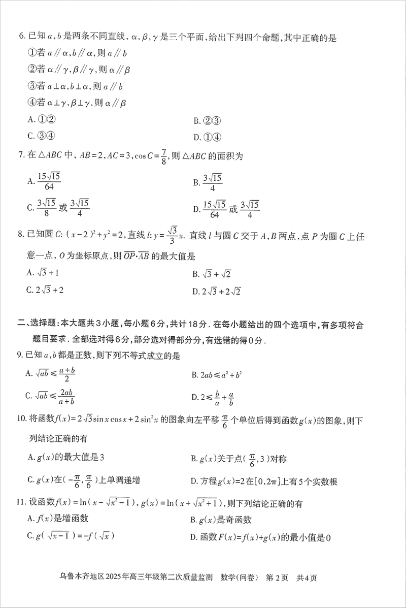 乌鲁木齐2025年高三第二次质量监测数学试题及答案汇总 时间:2025-03-27 新疆 数学试题 乌鲁木齐2025年高三第二次质量监测数学考试已于近日开考,为方便考生考后及时查看考试情况,查漏补缺、弥补不足,本文整理了试题答案解析相关信息! 汇总:乌鲁木齐2025年高三第二次质量监测试题及答案汇总 数学试题及答案解析