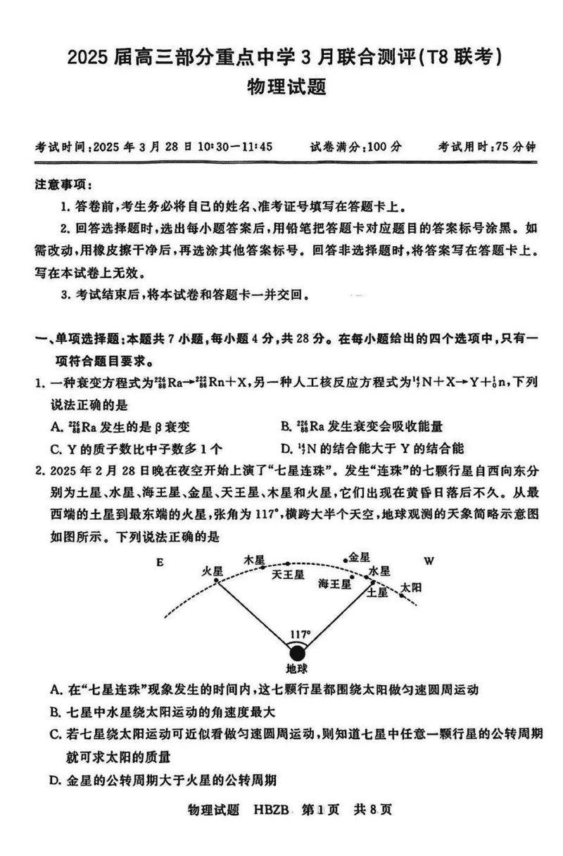 2025届八省八校T8联考高三3月联合测评物理(河南版)试题及答案汇总