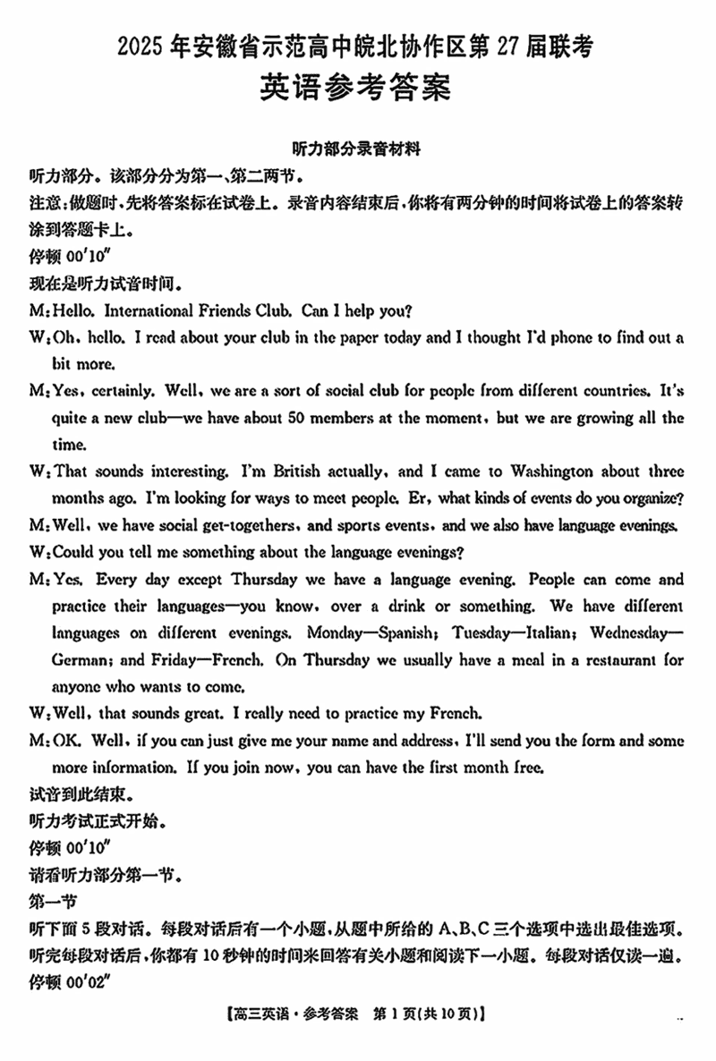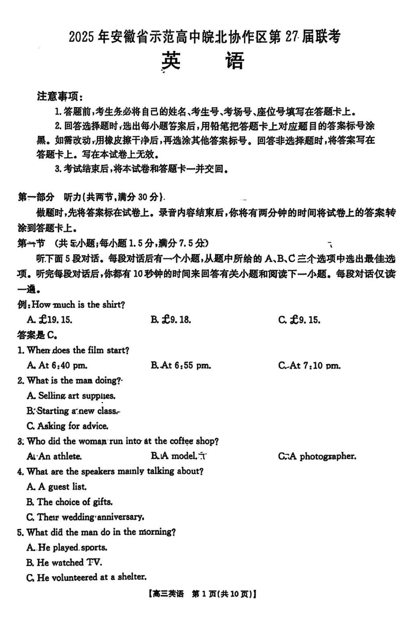 2025年安徽省示范高中皖北协作区第27届联考英语考试已于近日开考,为方便考生考后及时查看考试情况,查漏补缺、弥补不足,本文整理了试题答案解析相关信息!