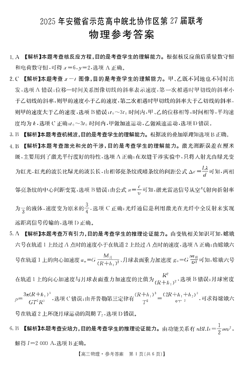 汇总:2025年安徽省示范高中皖北协作区第27届联考试题及答案汇总