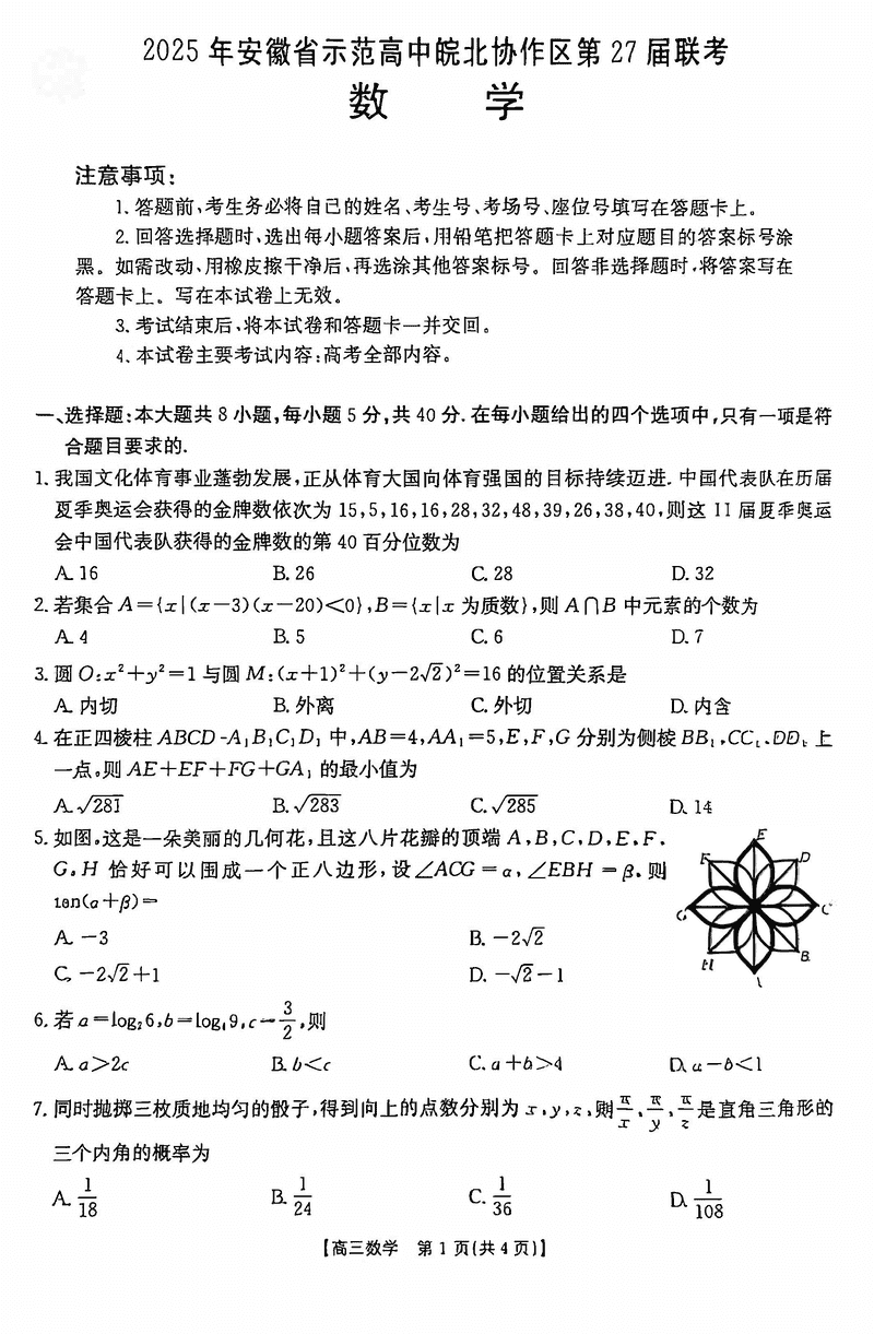 2025年安徽省示范高中皖北协作区第27届联考数学试题及答案汇总