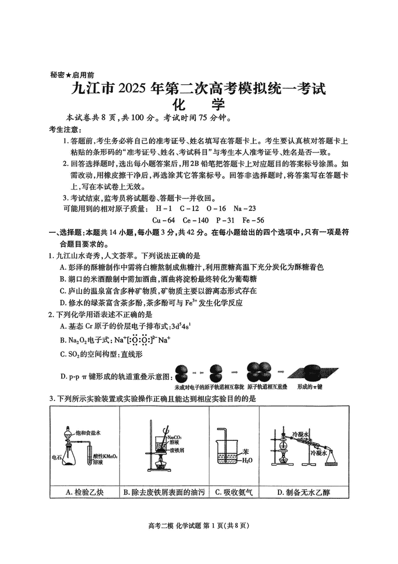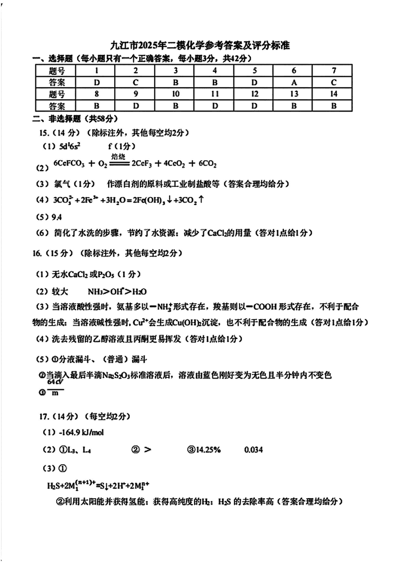江西省九江市2025年第二次模考化学考试已于近日开考,为方便考生考后及时查看考试情况,查漏补缺、弥补不足,本文整理了试题答案解析相关信息!