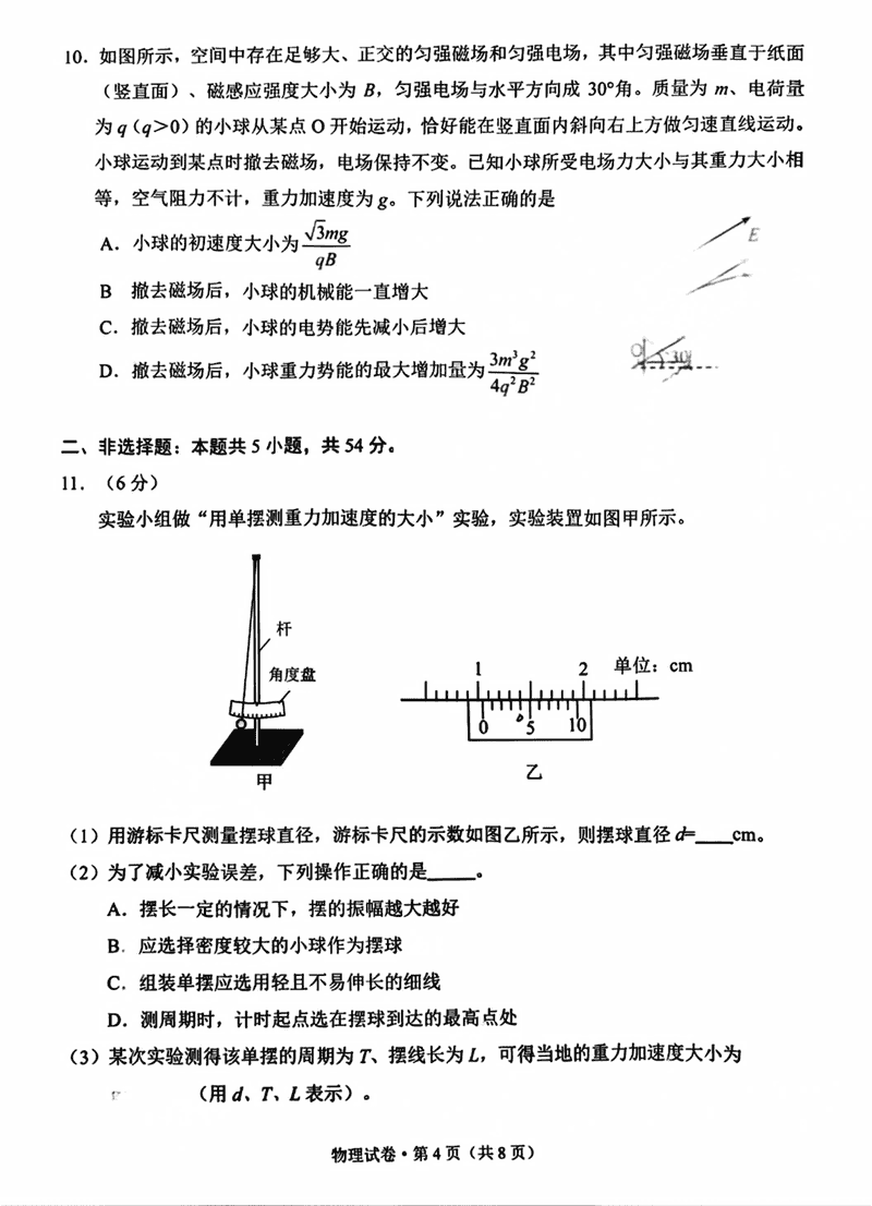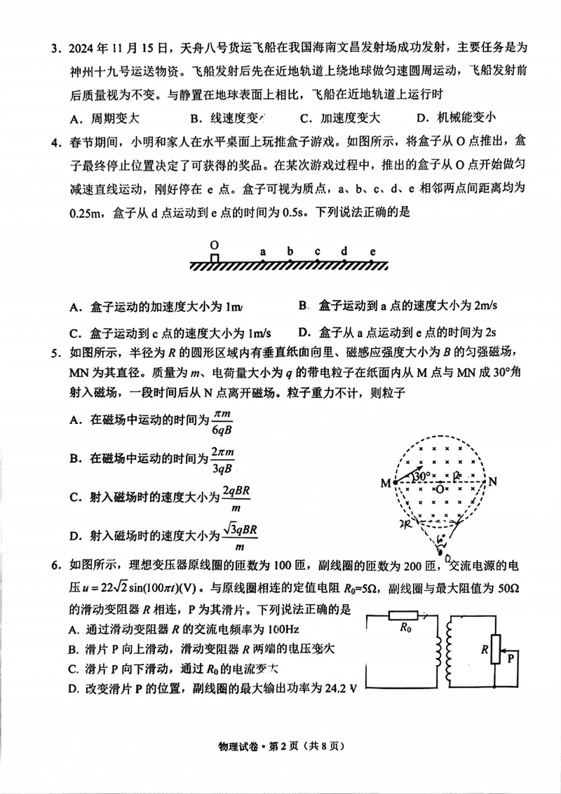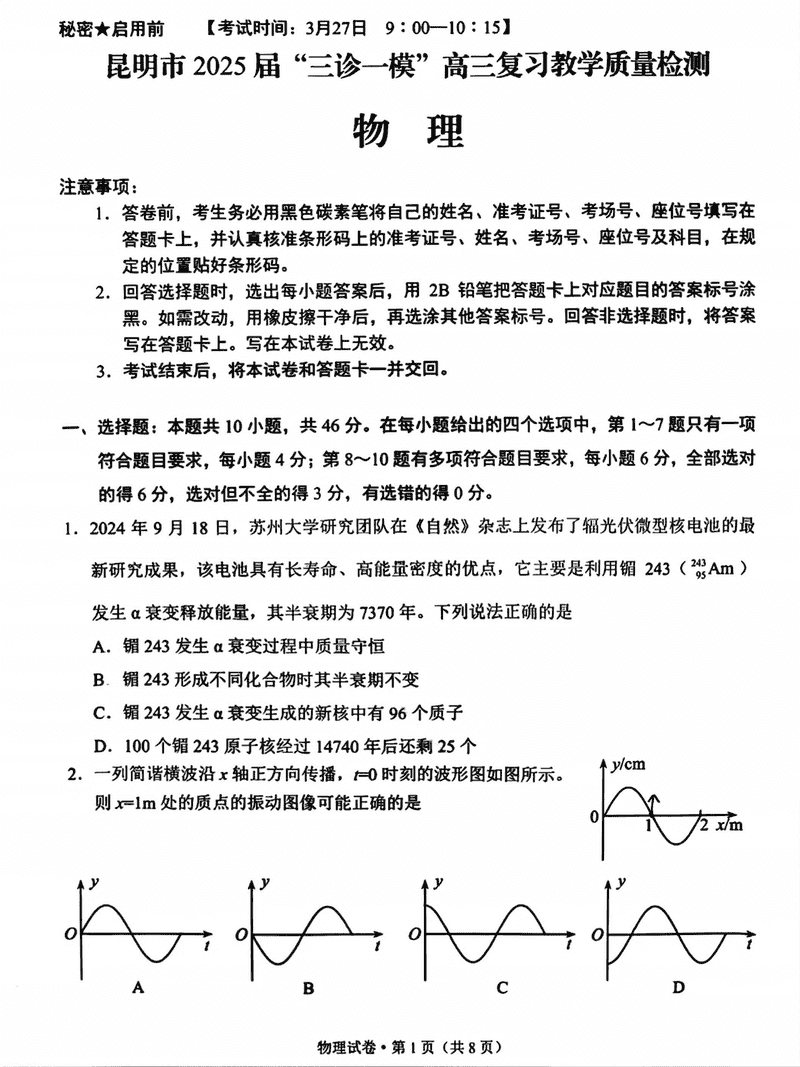 昆明市2025届“三诊一模”高三复习教学质检物理试题及答案