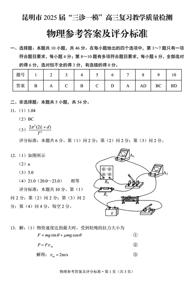 昆明市2025届“三诊一模”高三复习教学质检物理考试已于近日开考,为方便考生考后及时查看考试情况,查漏补缺、弥补不足,本文整理了试题答案解析相关信息!