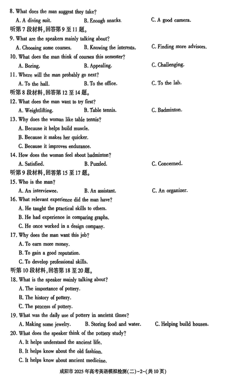 咸阳市2025年高考模拟检测(二)英语试题及答案 时间:2025-03-31 陕西 英语试题 咸阳市2025年高考模拟检测(二)英语考试已于近日开考,为方便考生考后及时查看考试情况,查漏补缺、弥补不足,本文整理了试题答案解析相关信息! 汇总:陕西省咸阳市2025届高三第二次模拟试题及答案汇总 英语试题及答案解析