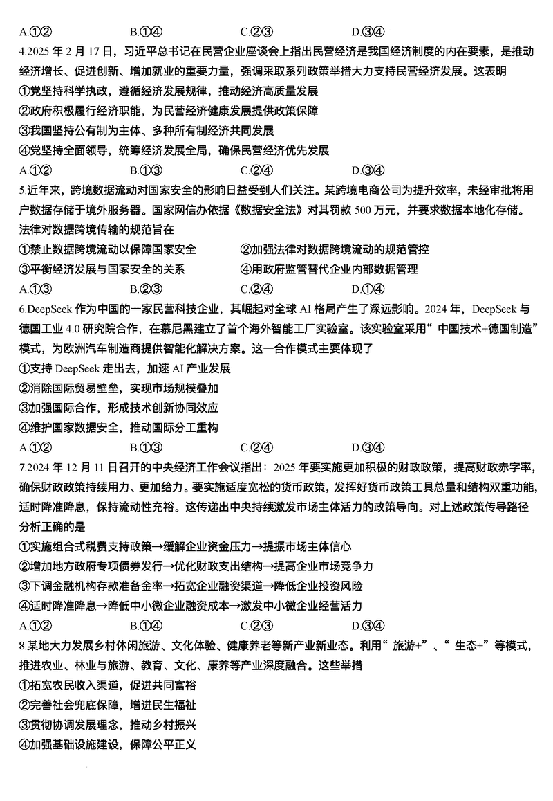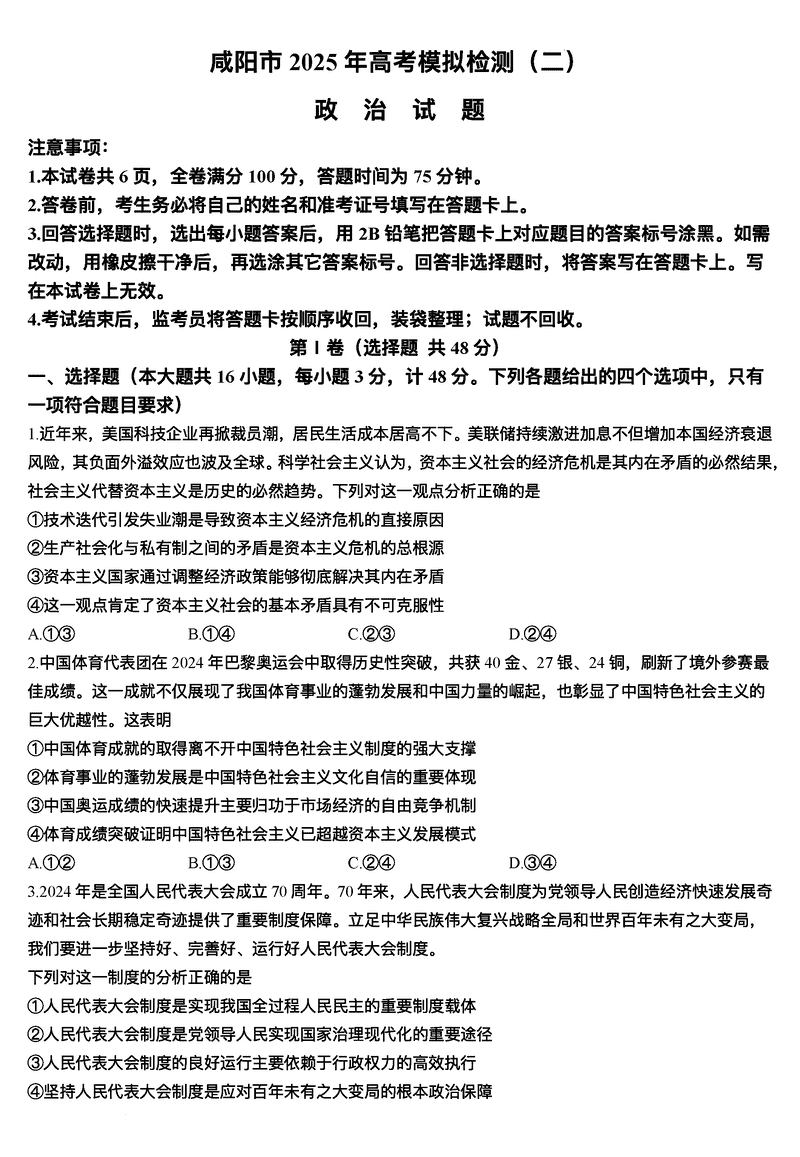 咸阳市2025年高考模拟检测(二)政治试题及答案 时间:2025-03-31 陕西 文综试题 咸阳市2025年高考模拟检测(二)政治考试已于近日开考,为方便考生考后及时查看考试情况,查漏补缺、弥补不足,本文整理了试题答案解析相关信息! 汇总:陕西省咸阳市2025届高三第二次模拟试题及答案汇总 政治试题及答案解析