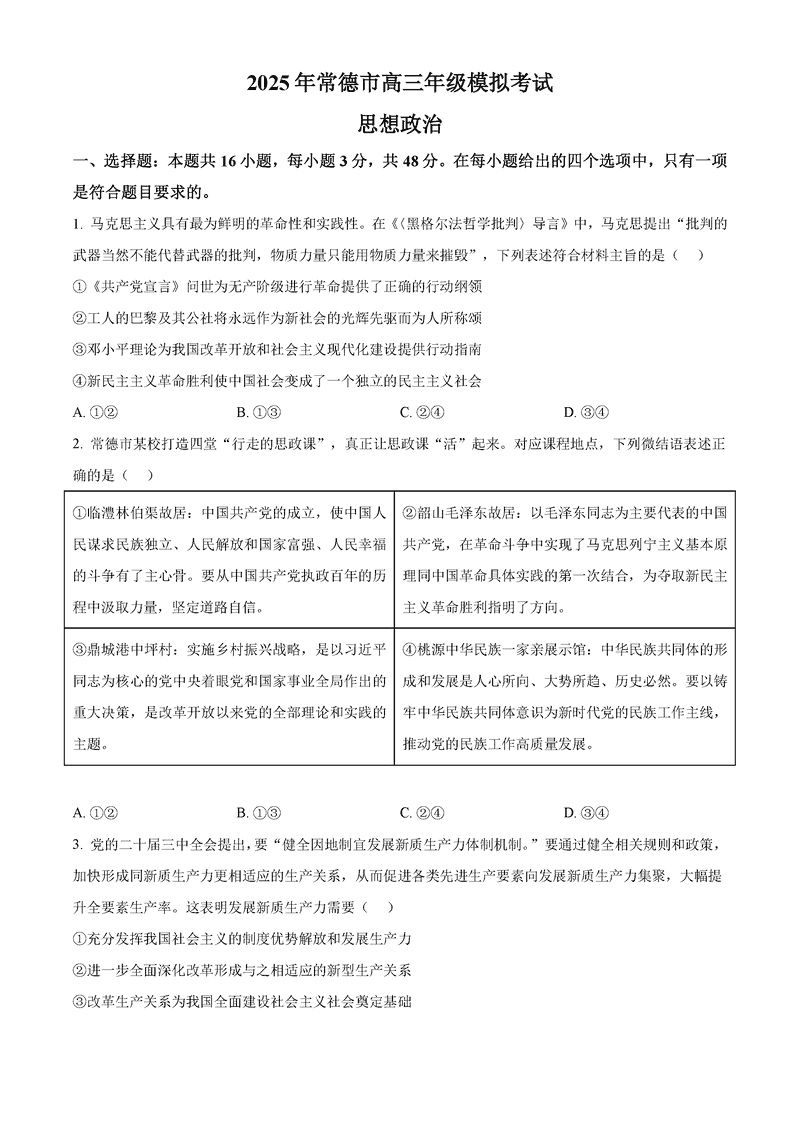 常德二模2025届高三下学期模考政治试题及答案 时间:2025-04-03 湖南 文综试题 常德二模2025届高三下学期模考政治考试已于近日开考,为方便考生考后及时查看考试情况,查漏补缺、弥补不足,本文整理了试题答案解析相关信息! 汇总:常德二模2025届高三下学期模拟考试试题及答案汇总 政治试题及答案解析