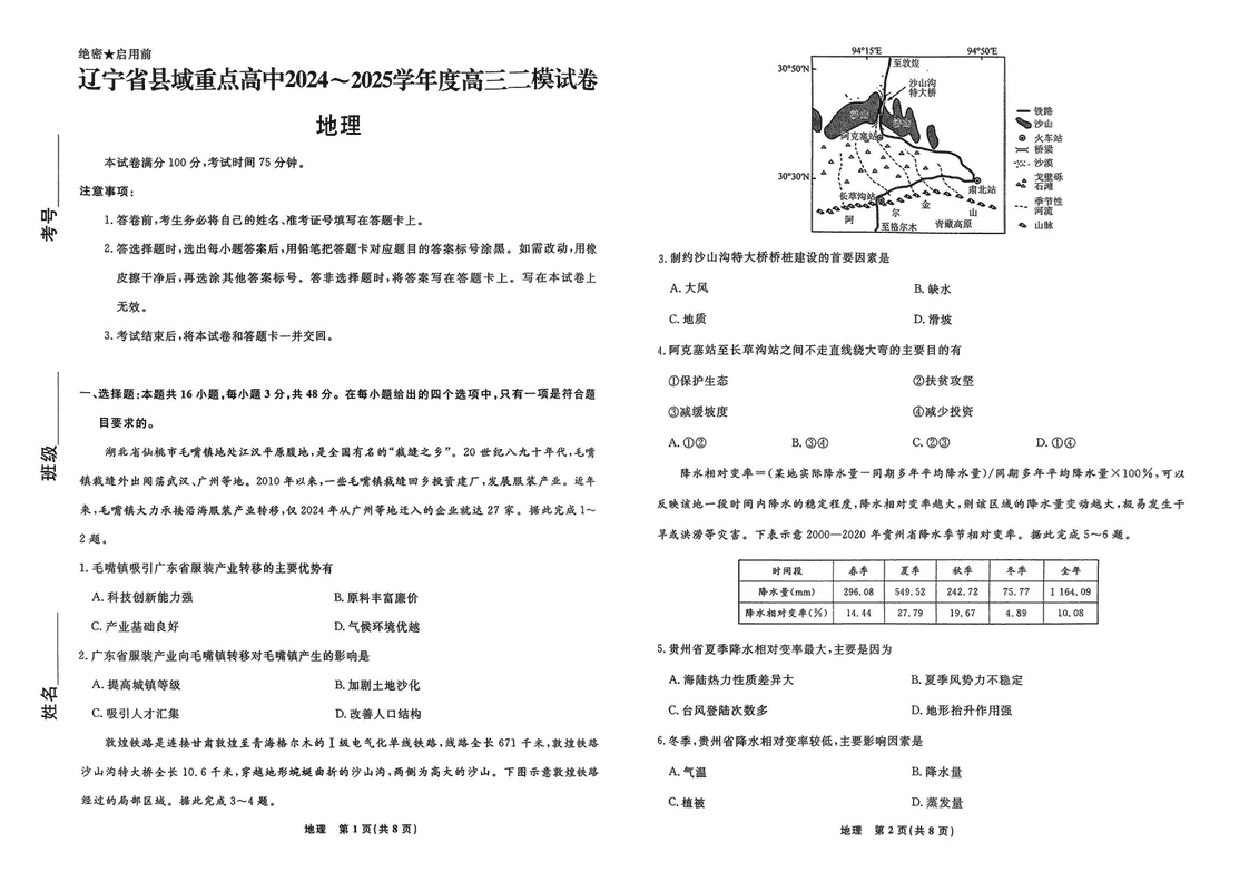 辽宁省县域重点高中2025年高三二模地理试题及答案