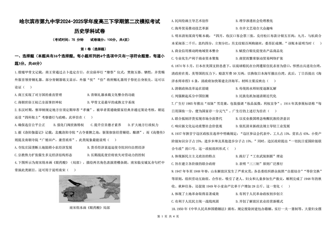 哈九中2025届高三下学期第二次模考历史试题及答案