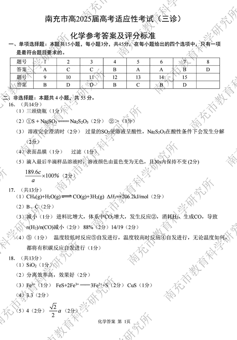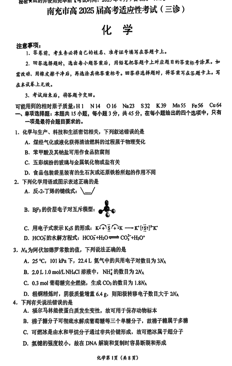 南充三诊高2025届高考适应性化学试题及答案 时间:2025-04-10 四川 理综试题 南充三诊高2025届高考适应性化学考试已于近日开考,为方便考生考后及时查看考试情况,查漏补缺、弥补不足,本文整理了试题答案解析相关信息! 汇总:南充三诊高2025届高考适应性考试试题及答案汇总 化学试题及答案解析