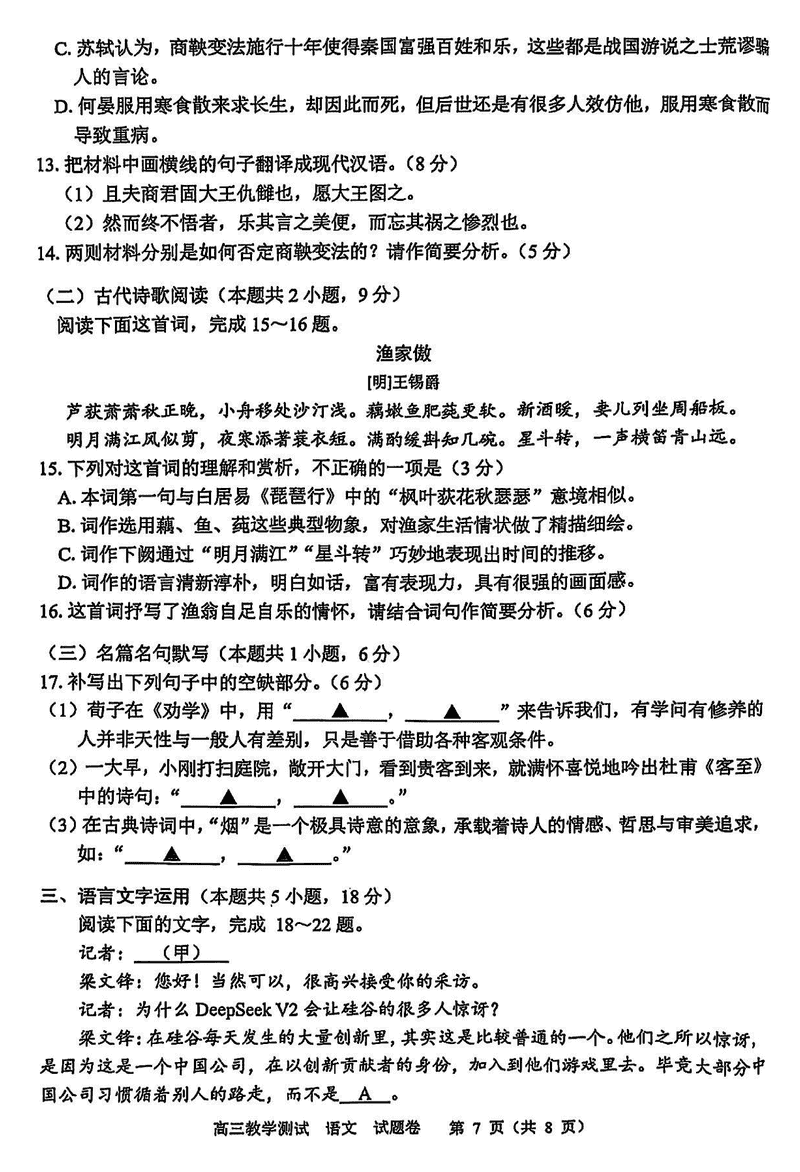 嘉兴二模2025届高三下学期4月教学测试语文试题及答案