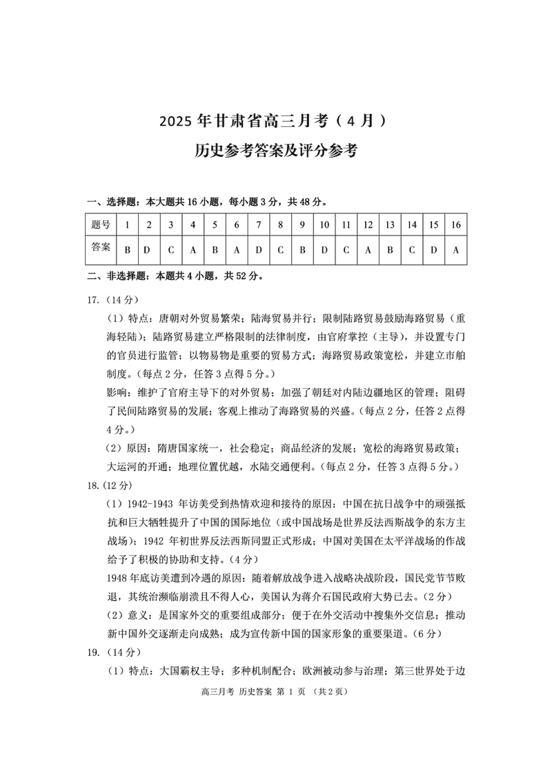 甘肃二诊2025年高三4月月考历史考试已于近日开考,为方便考生考后及时查看考试情况,查漏补缺、弥补不足,本文整理了试题答案解析相关信息!
