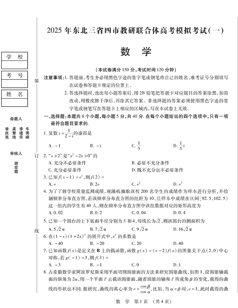 2025年东北三省四市教研联合体高考模拟考试(一)数学试题及答案