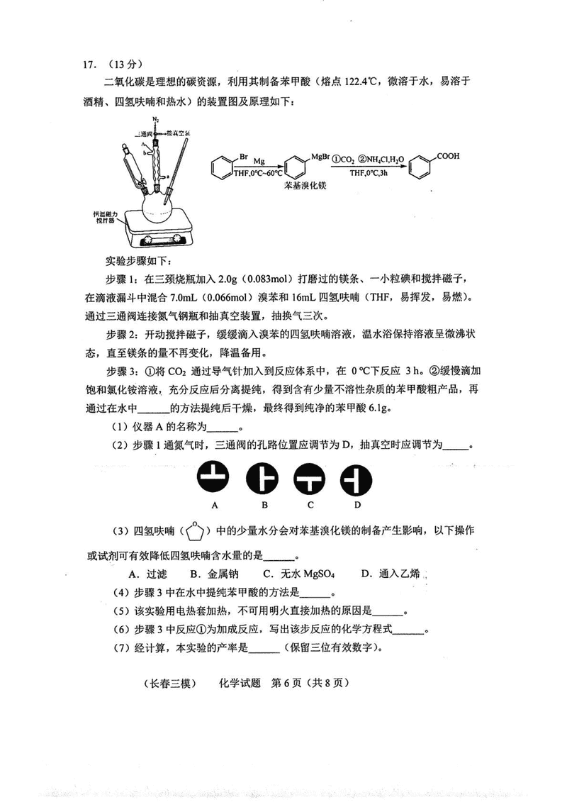 吉林长春2025届高三下学期质量监测(三)化学试题及答案