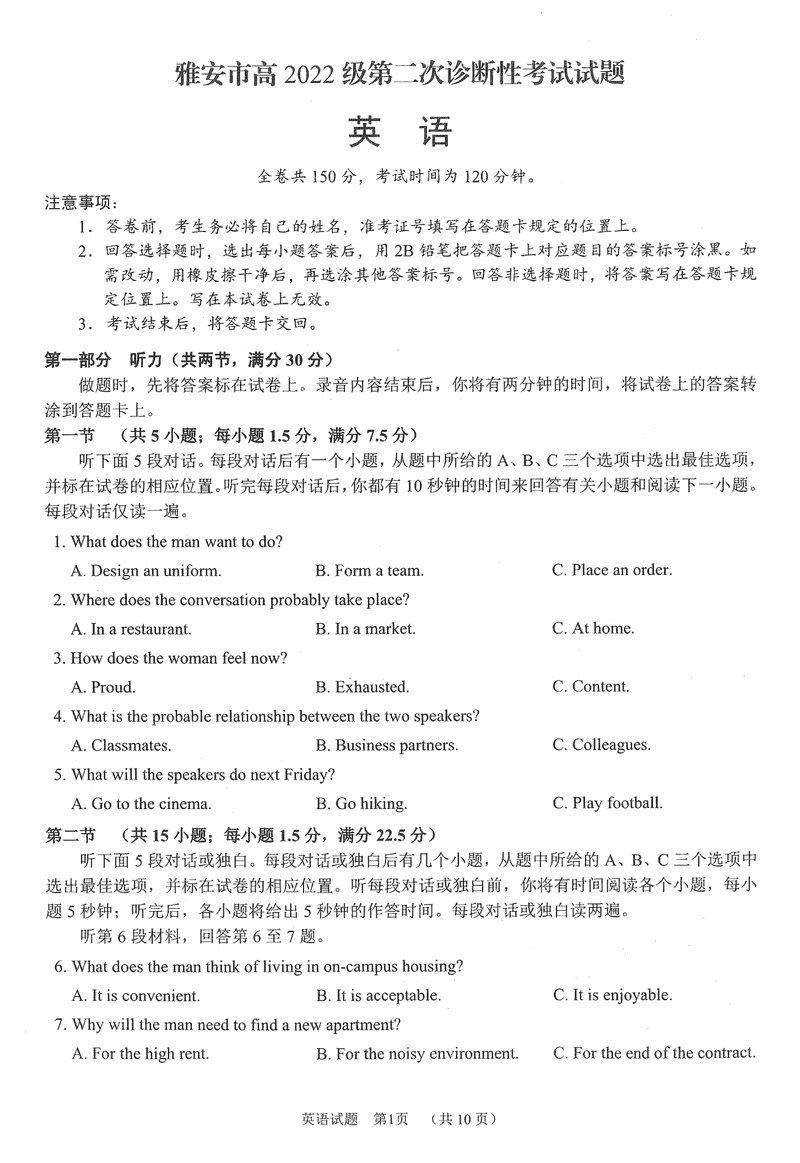 雅安市2025届高三下学期第二次诊断性英语考试已于近日开考,为方便考生考后及时查看考试情况,查漏补缺、弥补不足,本文整理了试题答案解析相关信息!