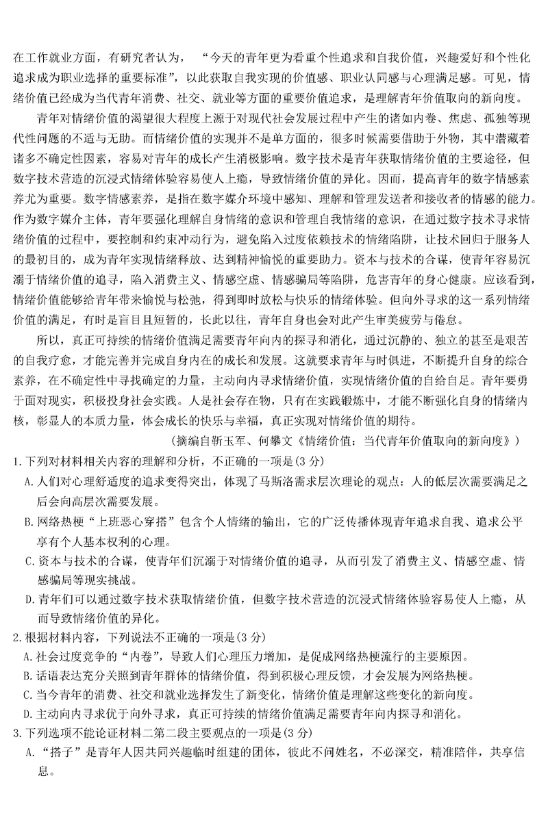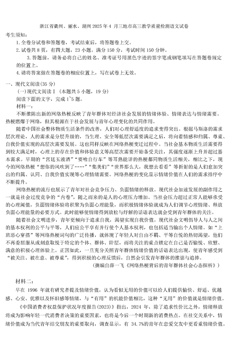 衢州、丽水、湖州三地市二模2025年4月高三教学质检语文试题及答案