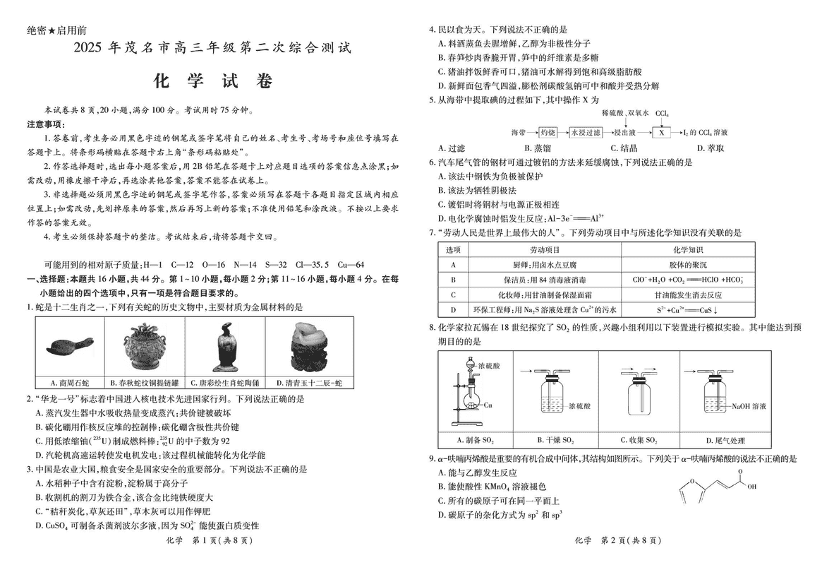 茂名二模2025年高三第二次综合测试化学试题及答案 时间:2025-04-15 广东 理综试题 茂名二模2025年高三第二次综合测试化学考试已于近日开考,为方便考生考后及时查看考试情况,查漏补缺、弥补不足,本文整理了试题答案解析相关信息! 汇总:茂名二模2025年高三第二次综合测试试题及答案汇总 化学试题及答案解析