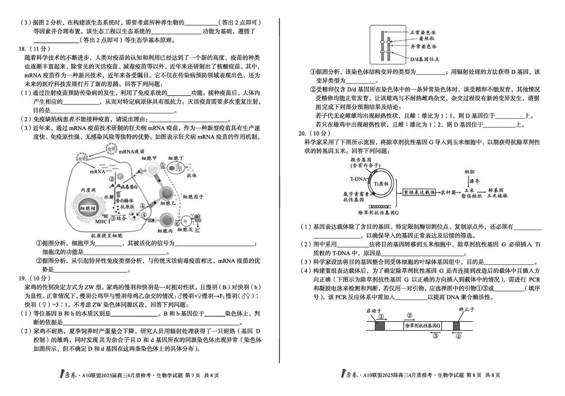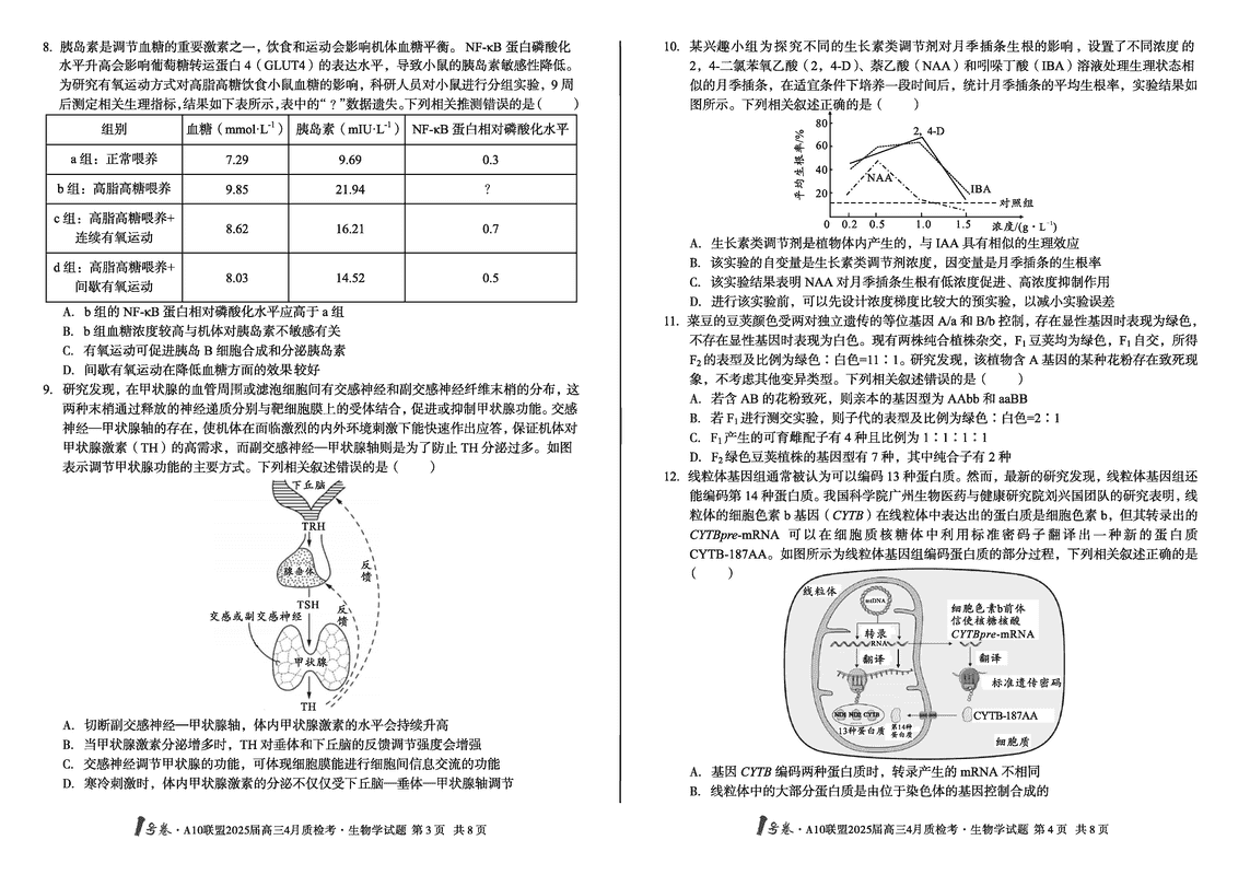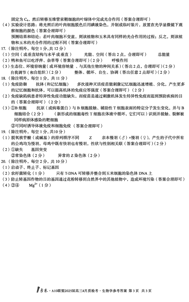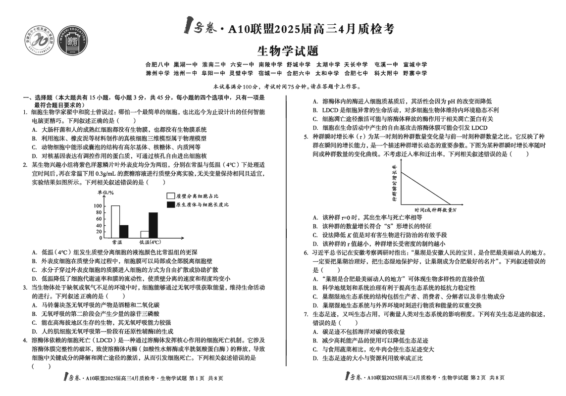安徽省1号卷·A10联盟2025届高三4月质检生物试题及答案