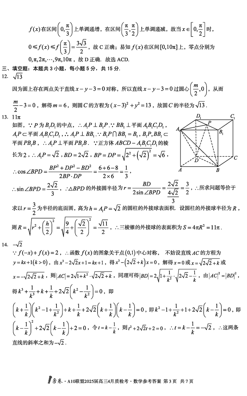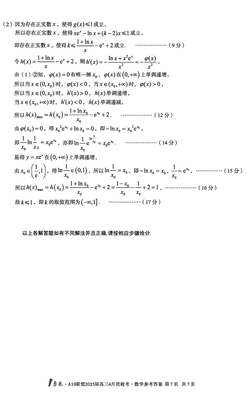 安徽省1号卷·A10联盟2025届高三4月质检数学试题及答案