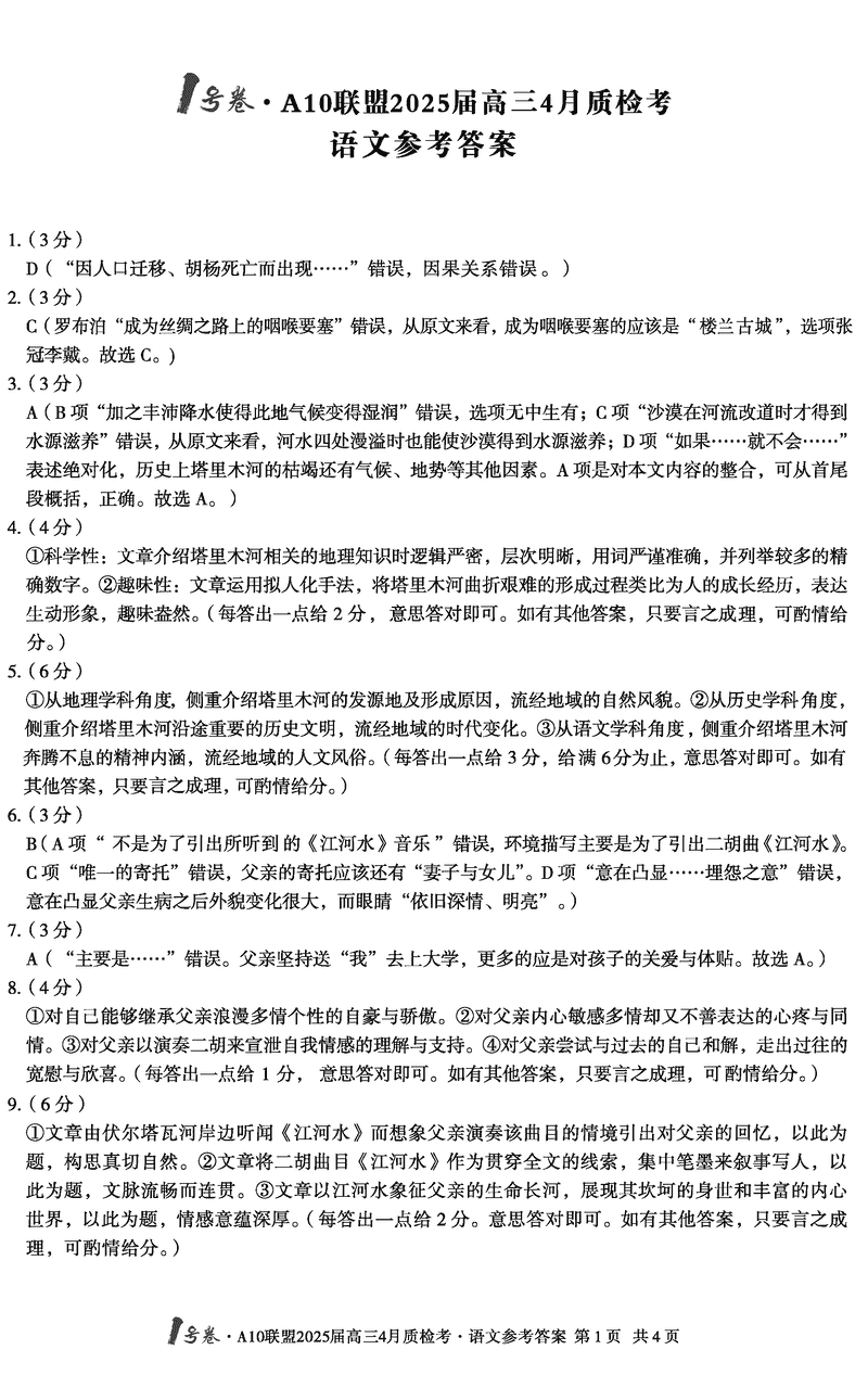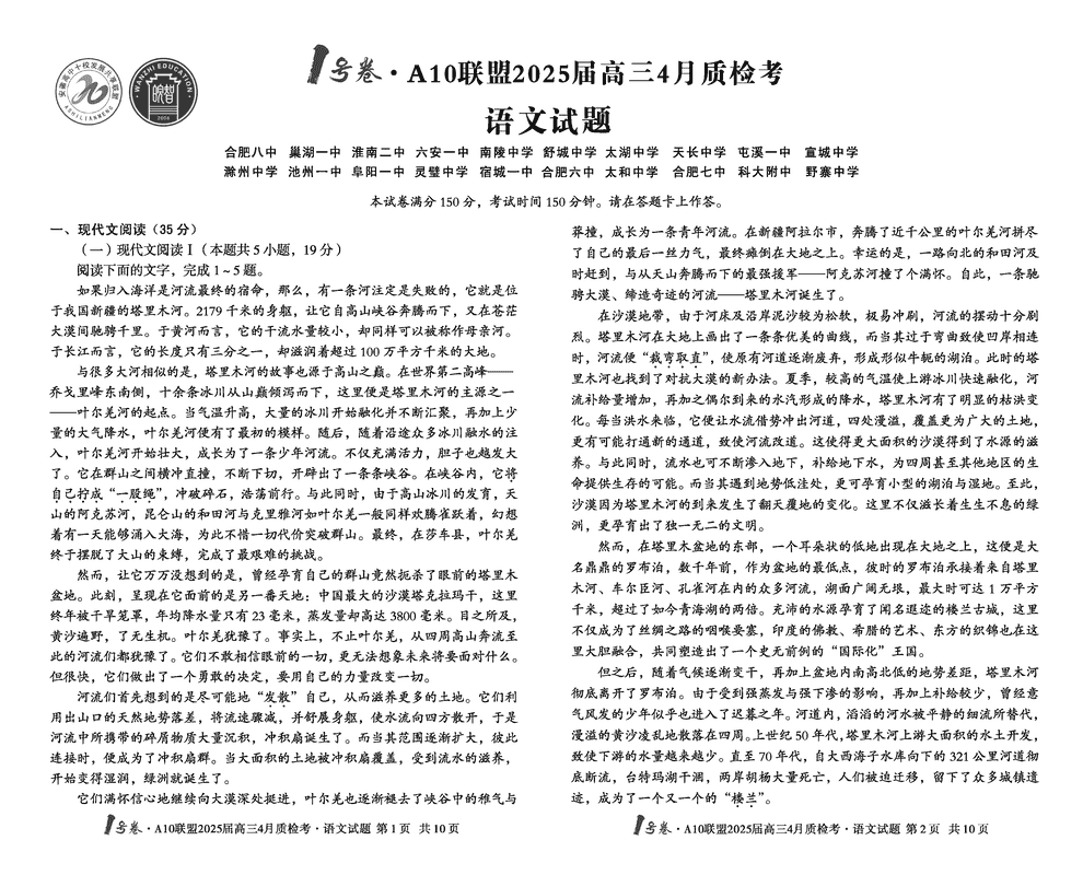 安徽省1号卷·A10联盟2025届高三4月质检语文试题及答案