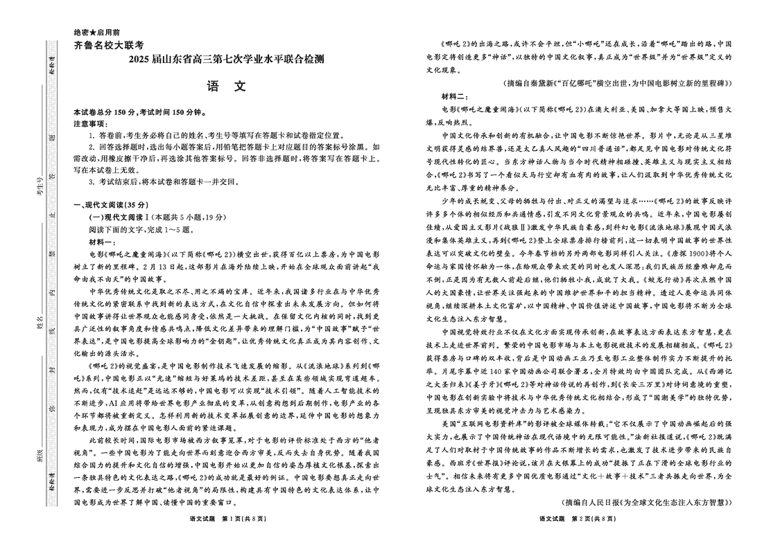 山东省齐鲁名校大联考2025届高三第七次学业水平联合检测语文考试已于近日开考,为方便考生考后及时查看考试情况,查漏补缺、弥补不足,本文整理了试题答案解析相关信息!