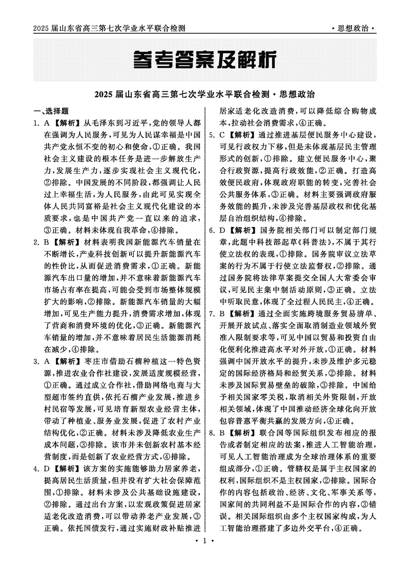 山东省齐鲁名校大联考2025届高三第七次学业水平联合检测政治试题及答案