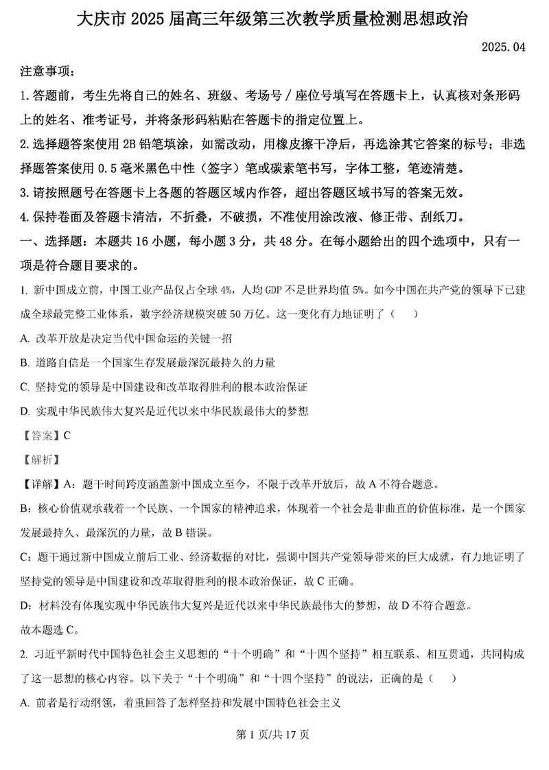 黑龙江大庆2025届高三下学期第三次模考政治考试已于近日开考,为方便考生考后及时查看考试情况,查漏补缺、弥补不足,本文整理了试题答案解析相关信息!