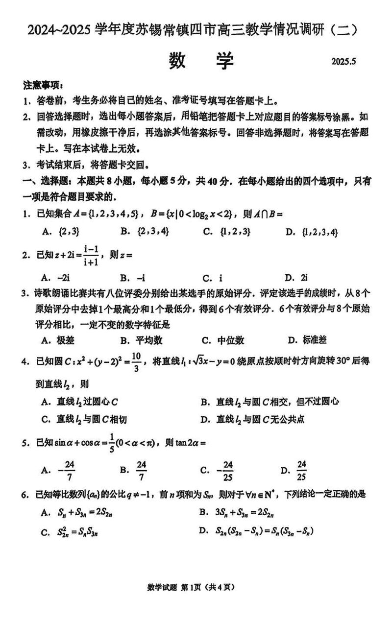 2024-2025学年苏锡常镇四市高三5月教学情况调研(二)数学试题及答案
