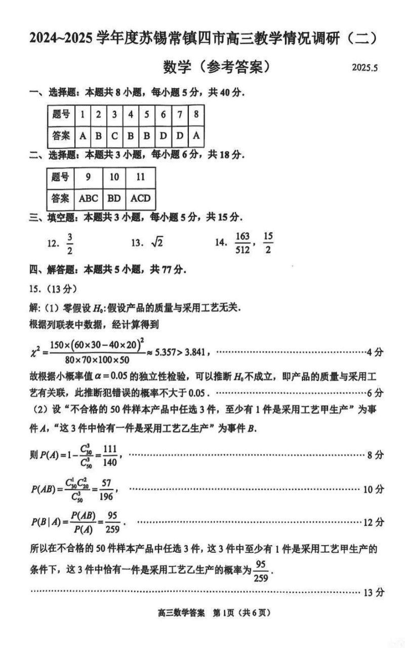 2024-2025学年苏锡常镇四市高三5月教学情况调研(二)数学考试已于近日开考,为方便考生考后及时查看考试情况,查漏补缺、弥补不足,本文整理了试题答案解析相关信息!