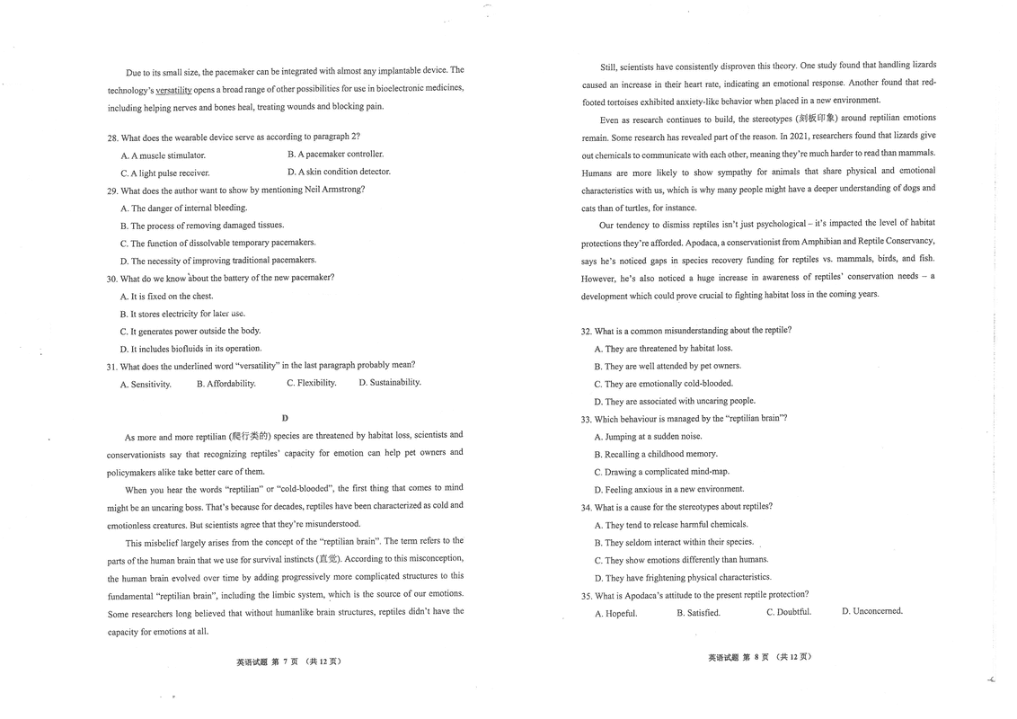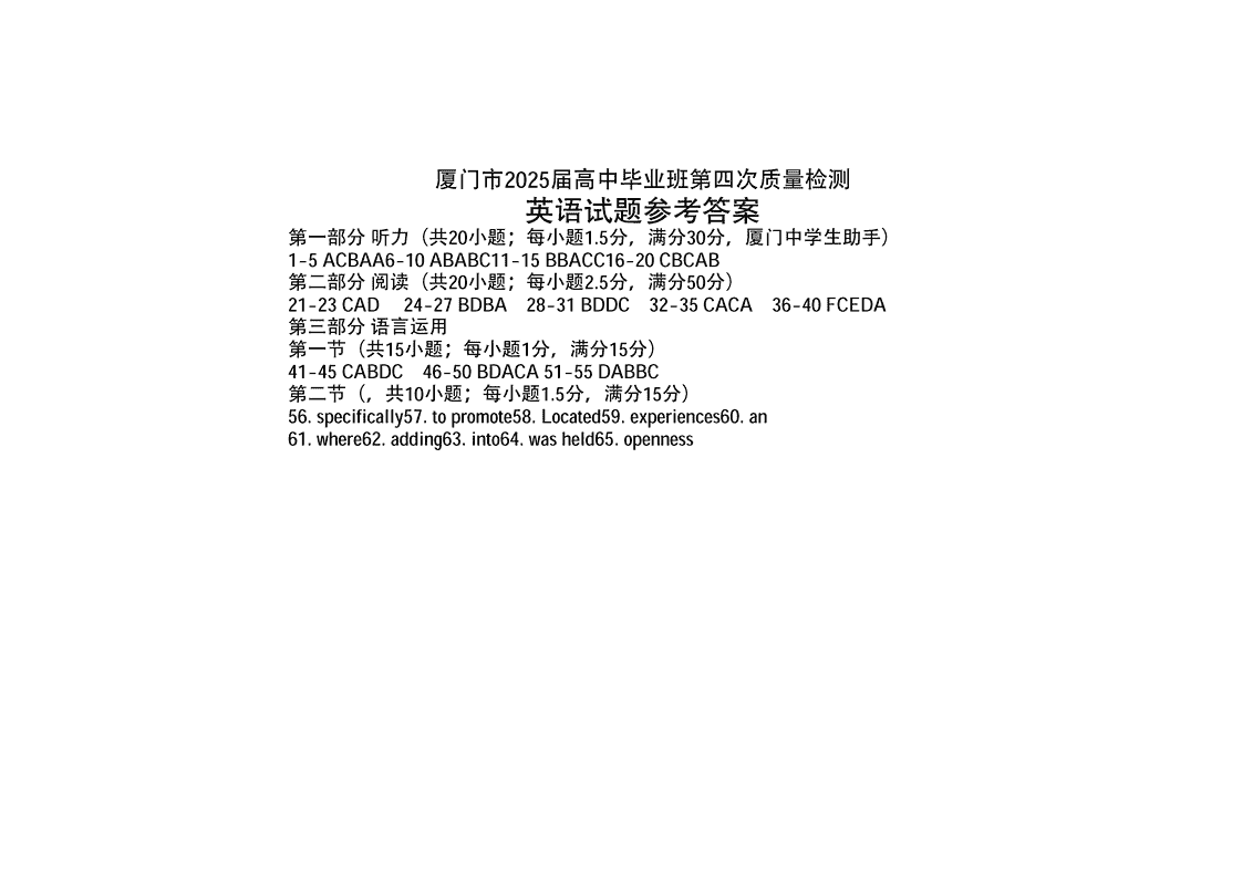福建厦门2025 届高三第四次质检英语试题及答案 时间:2025-05-12 福建 英语试题 福建厦门2025 届高三第四次质检英语考试已于近日开考,为方便考生考后及时查看考试情况,查漏补缺、弥补不足,本文整理了试题答案解析相关信息! 汇总:福建厦门2025 届高三第四次质量检测试题及答案汇总 英语试题及答案解析