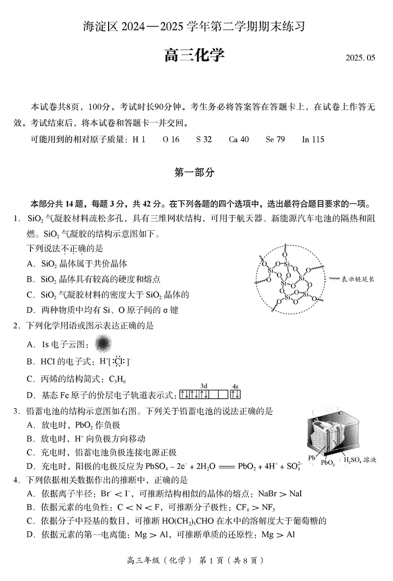 2025年北京市海淀区高三二模化学试题及答案 时间:2025-05-12 北京 理综试题 2025年北京市海淀区高三二模化学考试已于近日开考,为方便考生考后及时查看考试情况,查漏补缺、弥补不足,本文整理了试题答案解析相关信息! 汇总:2025年北京市海淀区高三二模试题及答案汇总 化学试题及答案解析
