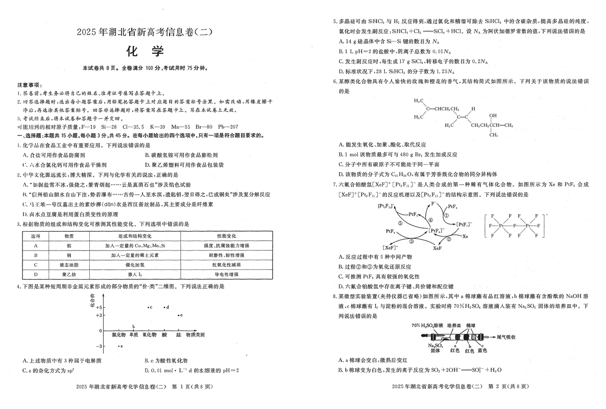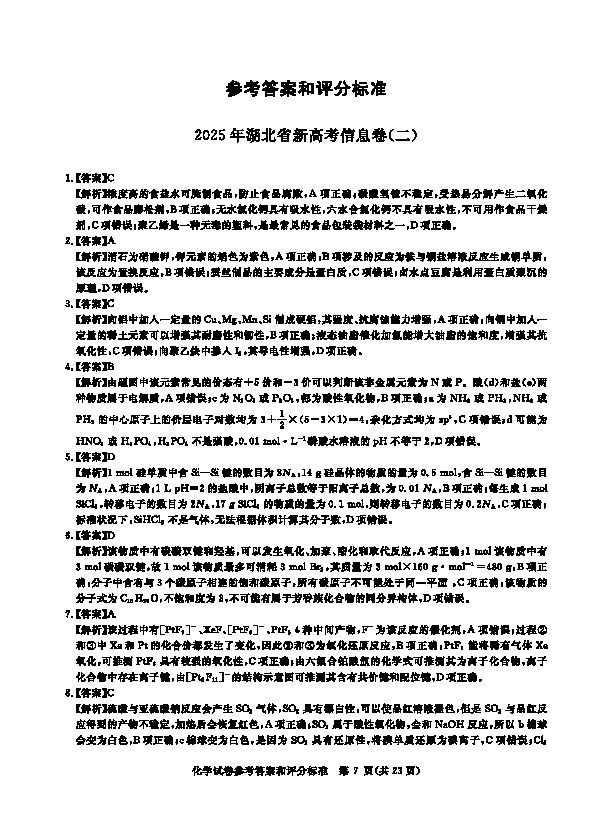 2025年湖北省新高考信息卷(二)化学试题及答案 时间:2025-05-14 湖北 理综试题 2025年湖北省新高考信息卷(二)化学考试已于近日开考,为方便考生考后及时查看考试情况,查漏补缺、弥补不足,本文整理了试题答案解析相关信息! 汇总:2025年湖北省新高考信息卷(二)试题及答案汇总 化学试题及答案解析